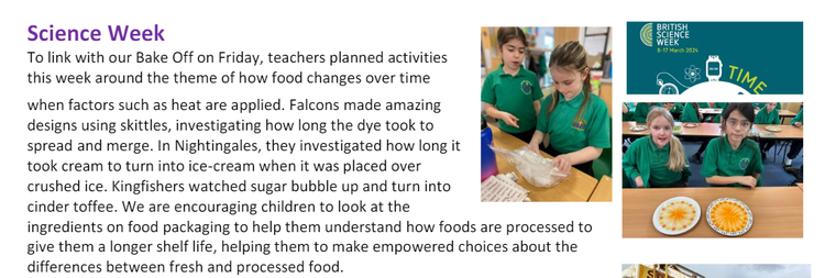 Children are offered a wide range of extra-curricular activities, visits, trips, visitors, and links with local secondary schools within our partnership to complement and broaden the curriculum. These are purposeful and link with the knowledge being taught in class. Regular events, such as Science Week, Bright Sparks science club, Science Oxford competition or project days, allow all pupils to come off-timetable, to provide broader provision and the acquisition and application of knowledge and skills.