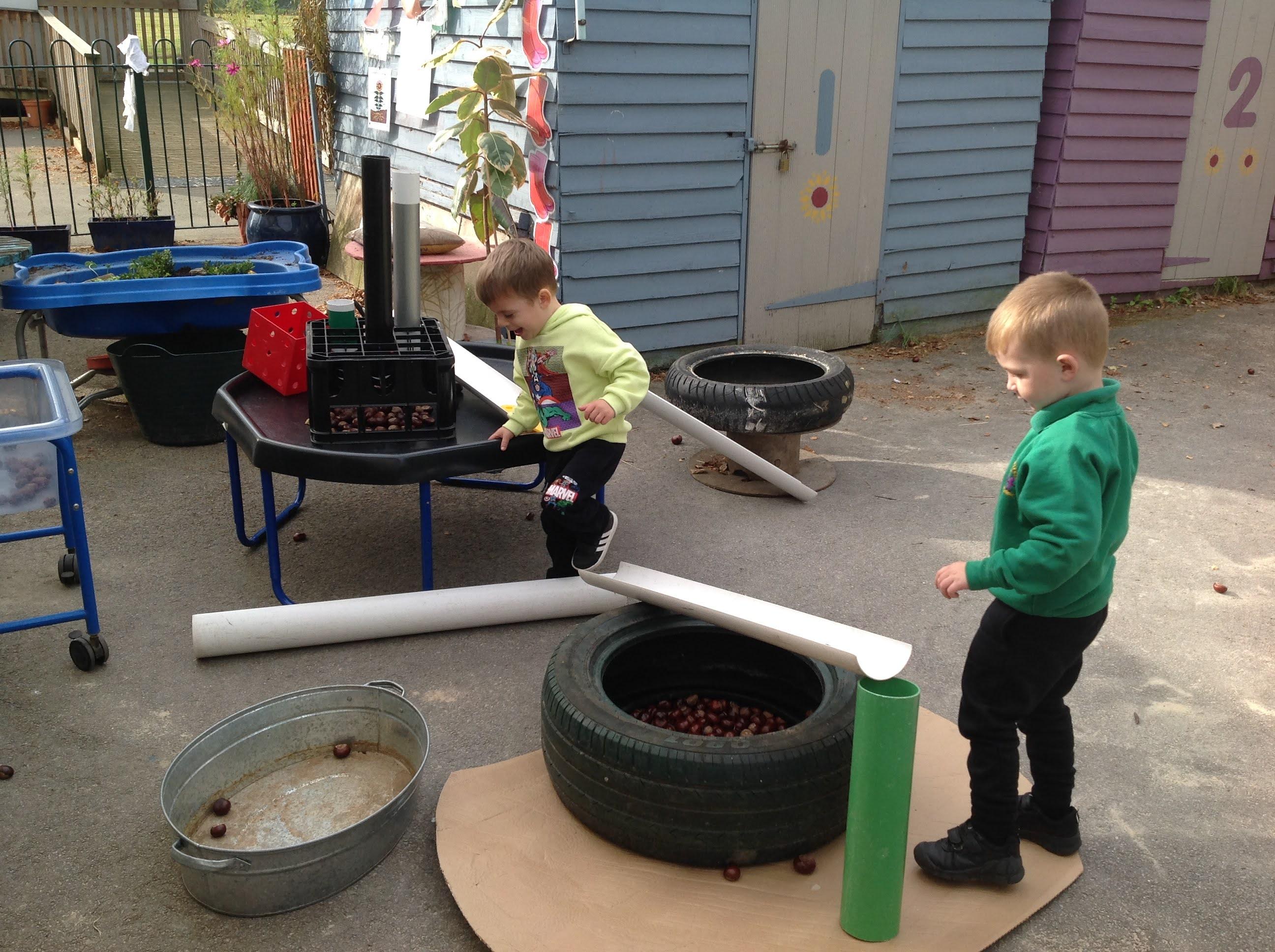 This week we have been reading the story of The Three Billy Goats Gruff and linking this to building bridges. We have made bridges for the cars and trains to travel over. We have also made bridges with the milk crates and planks in the garden that we can walk over. There has been lots of fun exploring and balancing with all the conkers that filled the water tray, and we even made a giant conker run with the guttering and pipes!