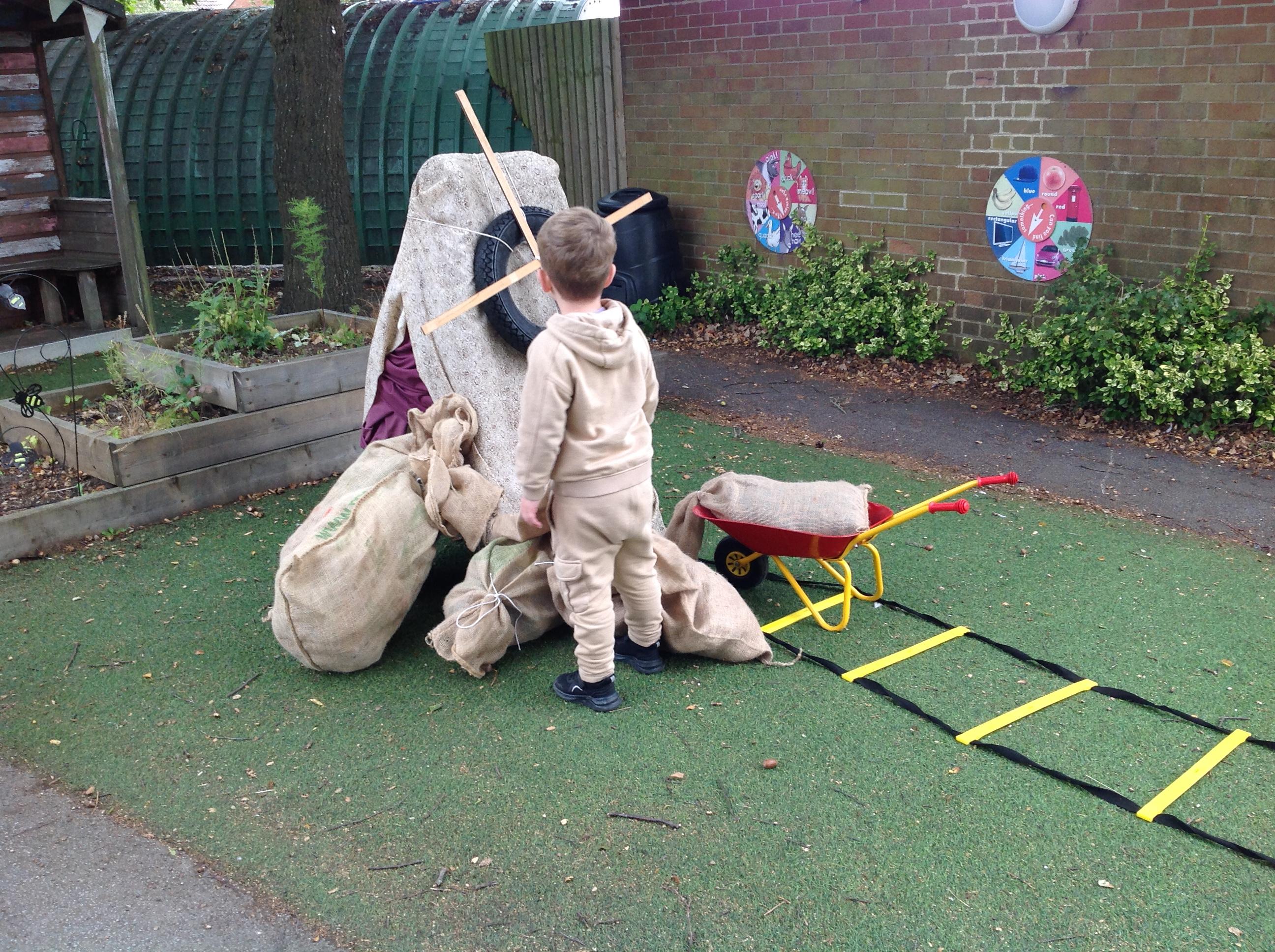 We have been learning how a windmill works to grind the corn into flour. We made our own pin windmills. The Barn Owls worked as millers taking the sacks of flour to the windmill.
