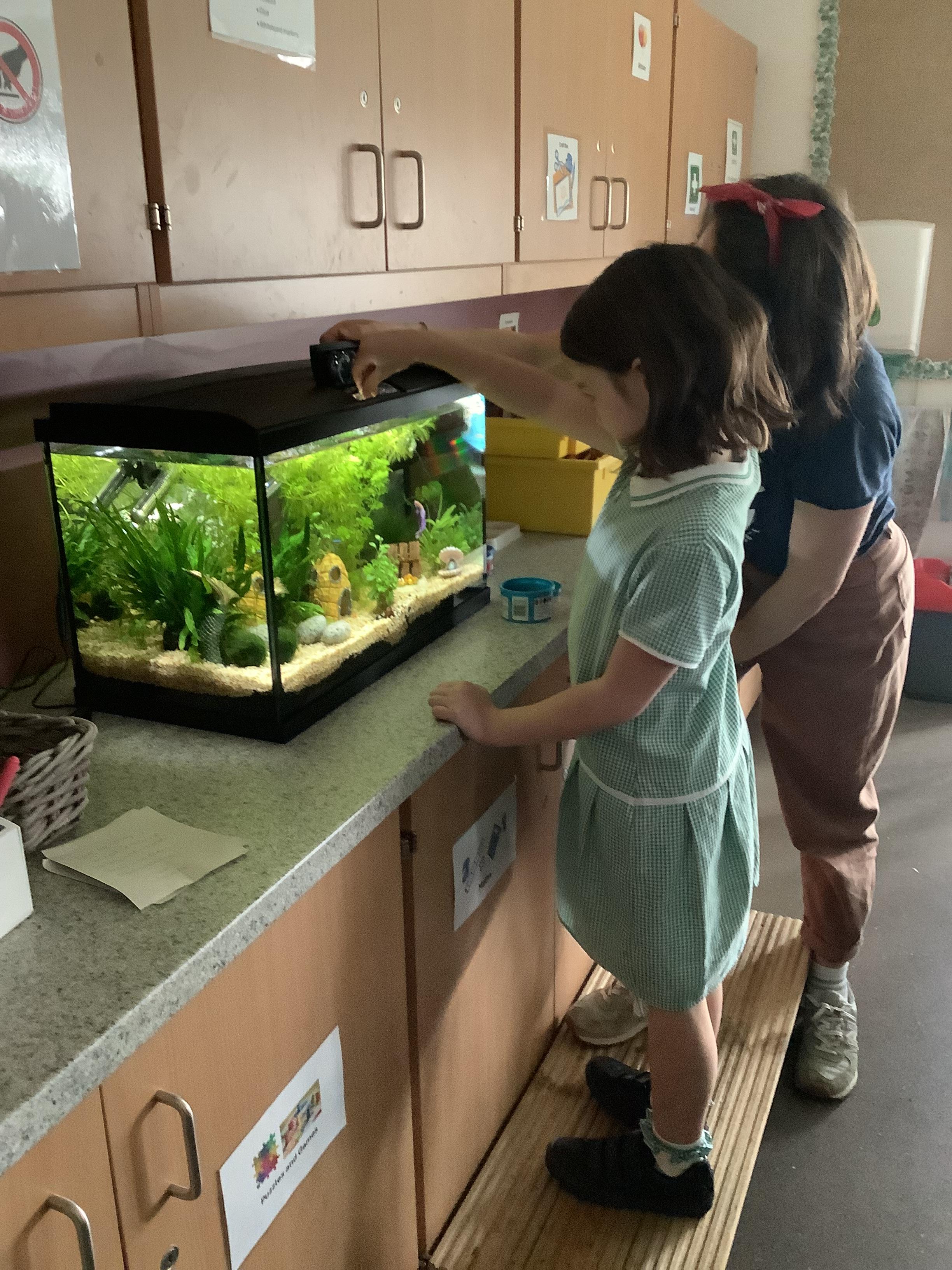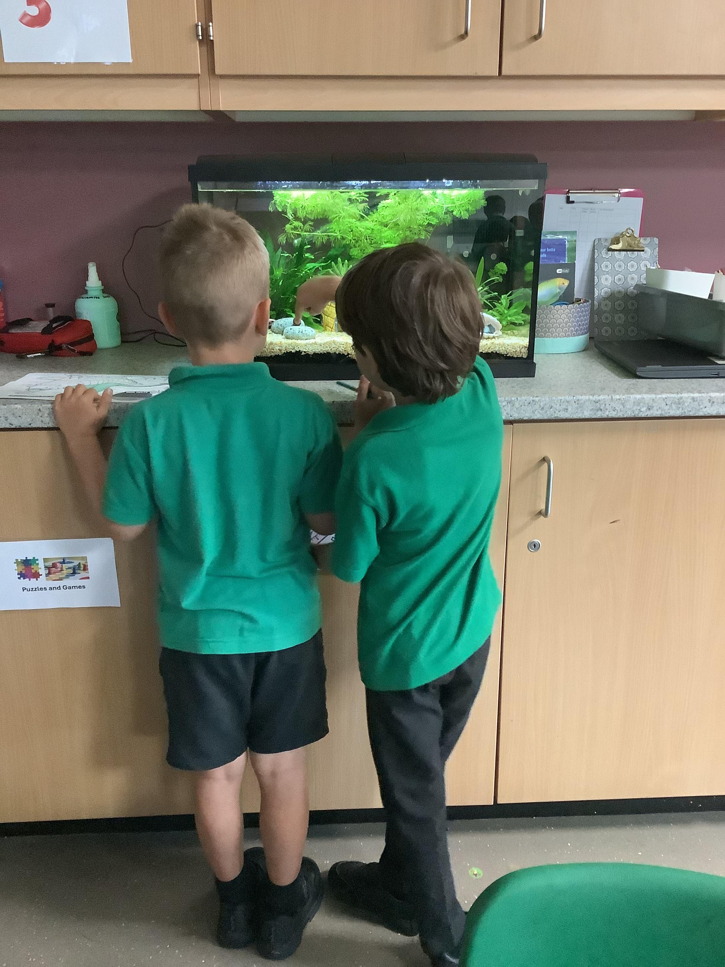 In our aquarium we have a Siamese Fighting Fish, Cardinal Tetra, an African Dwarf Frog, two Midget Suckermouth Catfish and a Sea snail. The children named our Siamese Fighting Fish 'Scales' and our frog 'Cool Dude'.