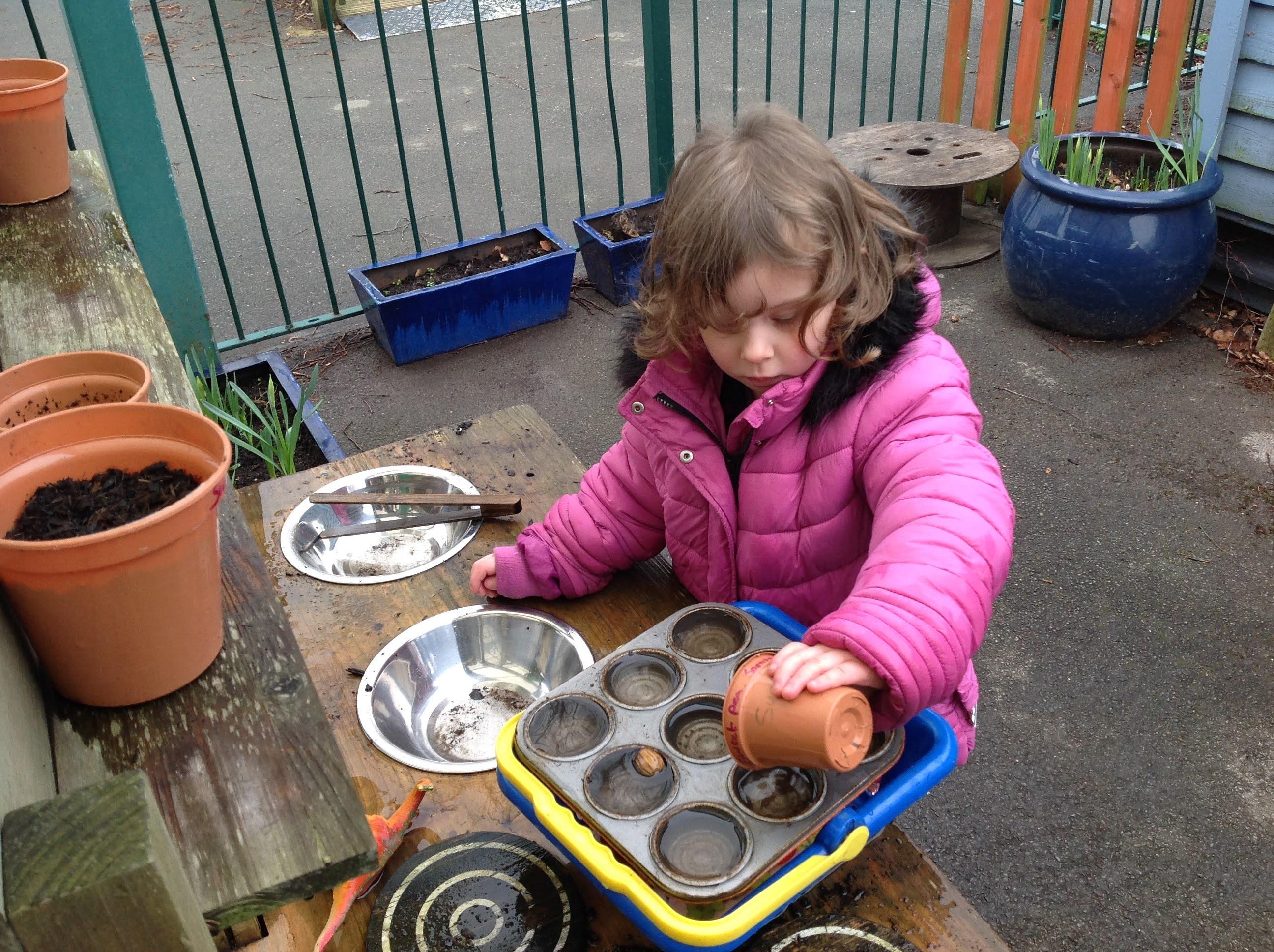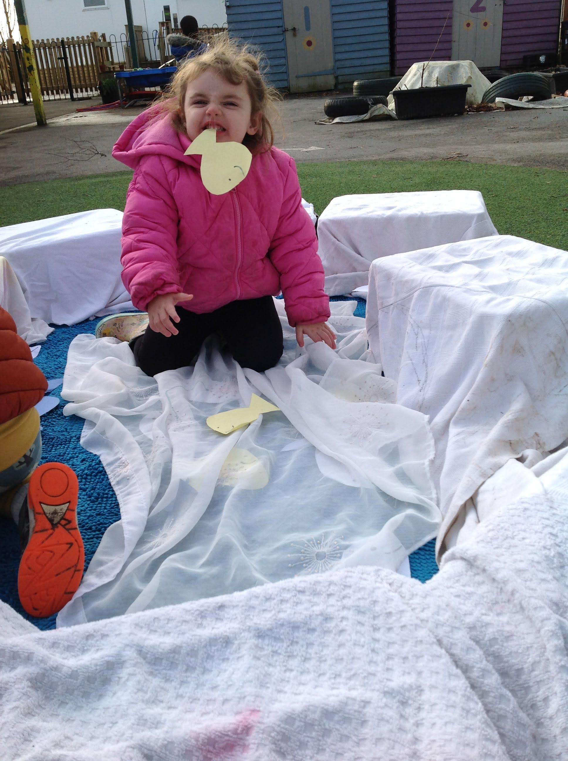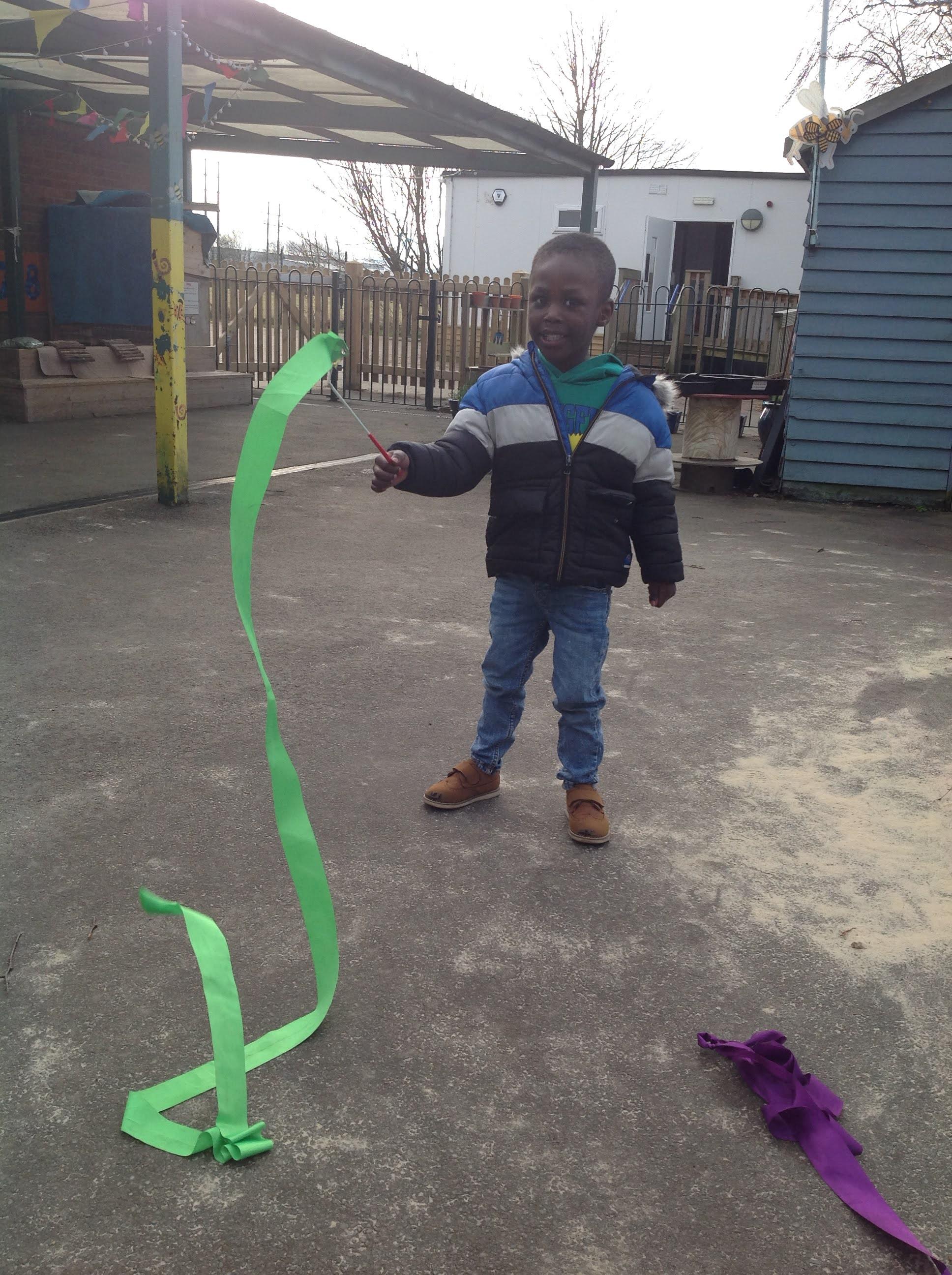 The Wendy House is a garden center this week and it has been very busy. Outside the Barn Owls have been very active, playing football, balancing on the apparatus and bucket stilts, making shape patterns with the ribbon sticks on a windy day, and fishing flowers from ice!