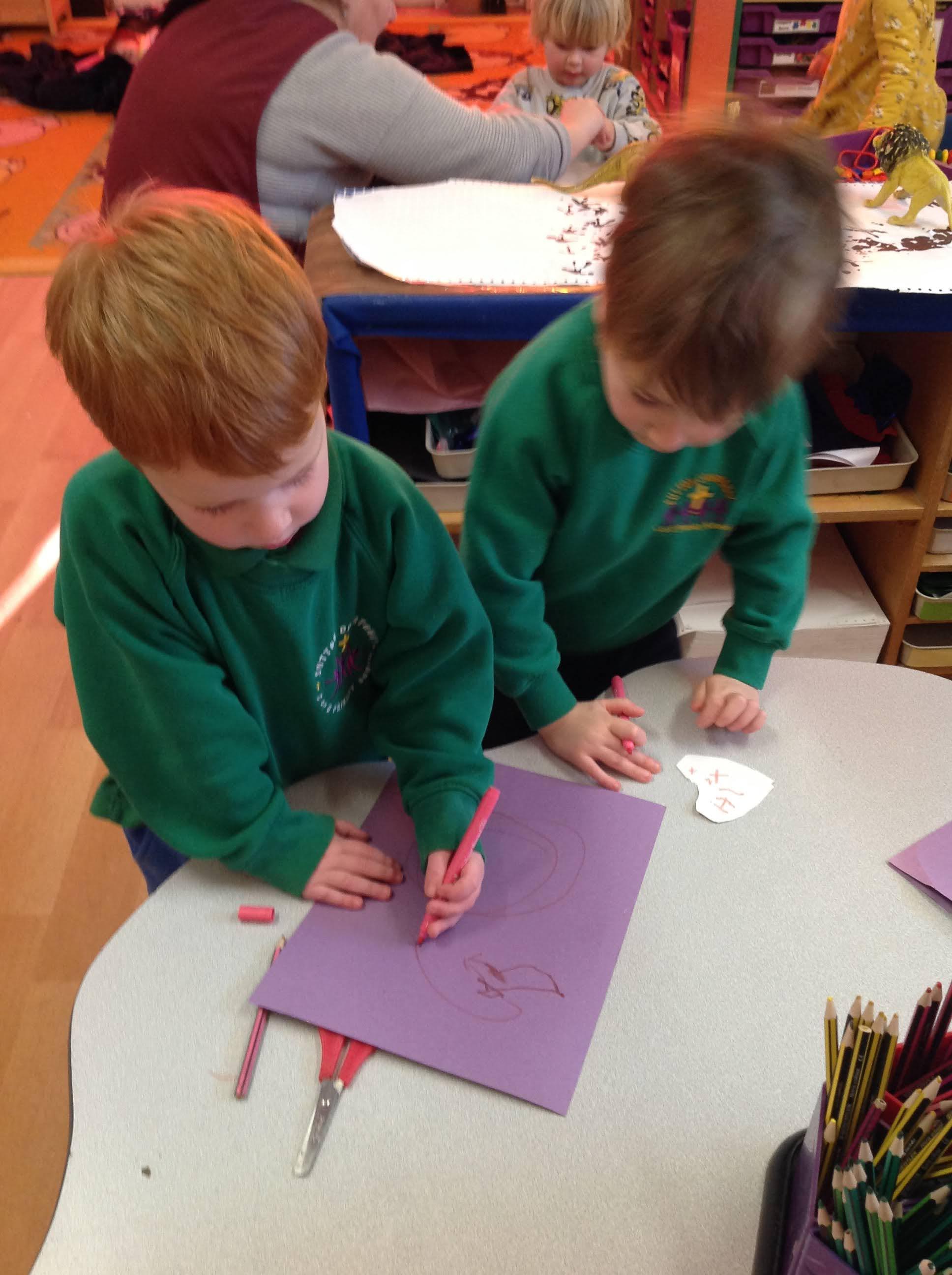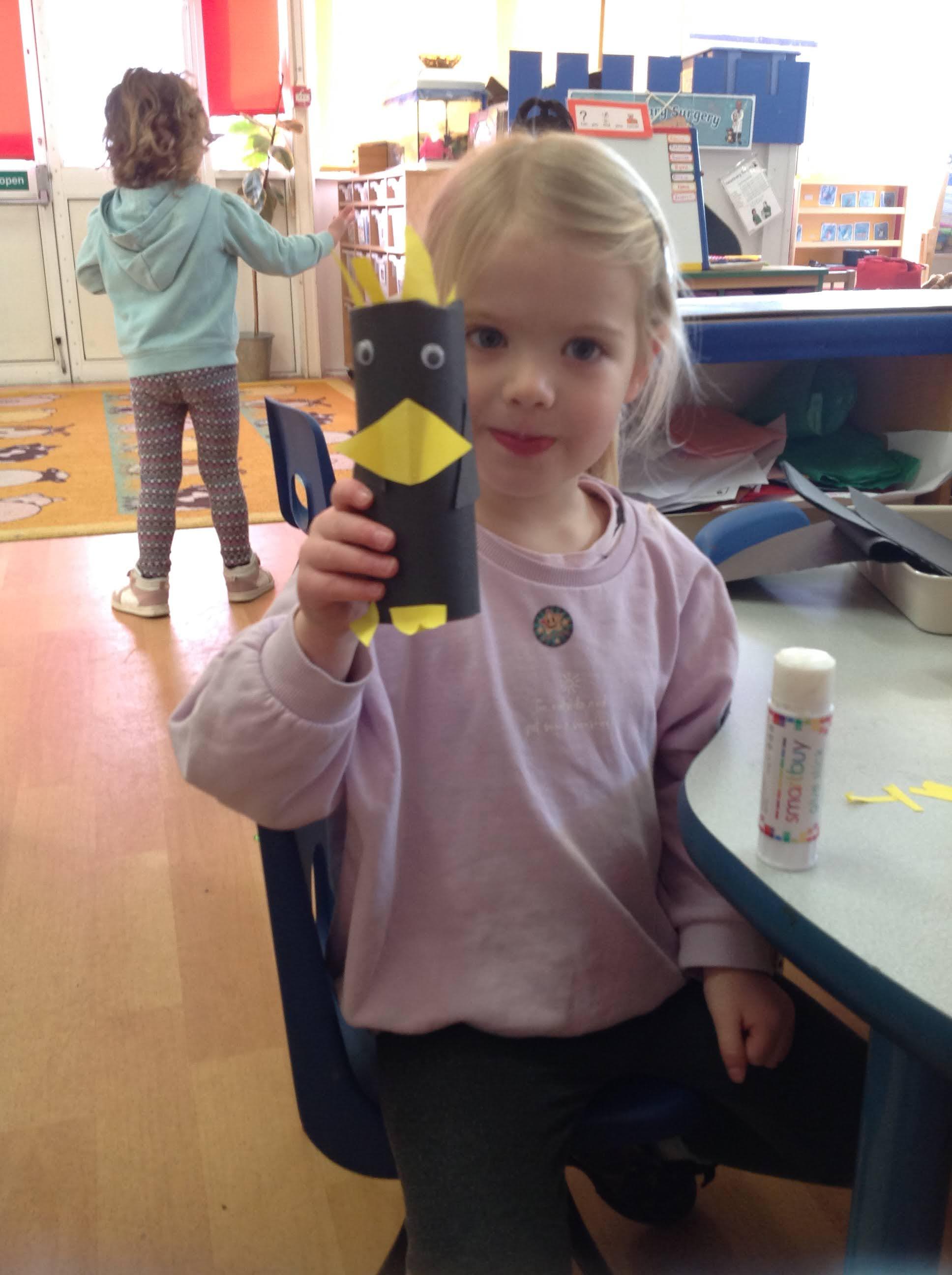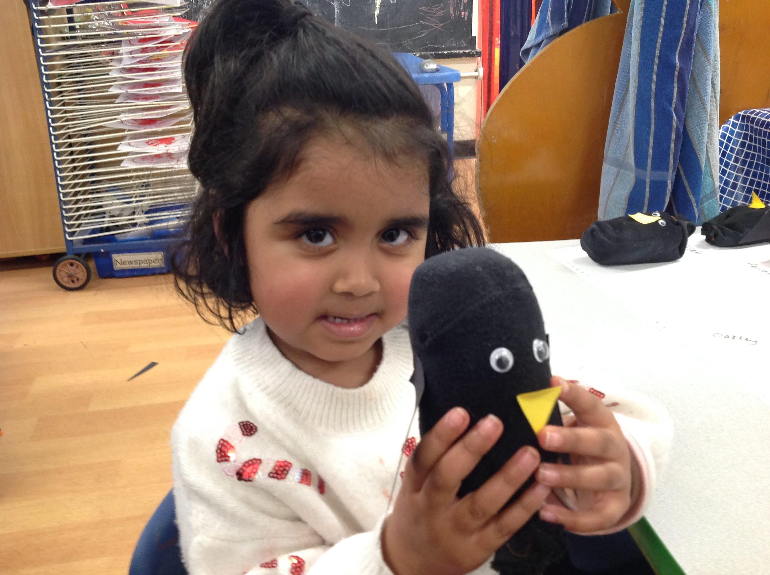 Our last week of term has been very busy indeed! The class story this week was Charlie Crow in the Snow by Paula Metcalfe. Charlie the Crow is getting confused by the changes he can see from his tree, until his friend Bear tells him that the changes are happening because the season is changing to winter. Bear goes into his den to hibernate, but Squirrel is around to keep Charlie company and have fun in the winter. The Barn Owls were brilliant at finding and describing the right shapes they needed to made their Charlie Crow puppet from an old sock! They could also say how Charlie the crow is different to Wellington the penguin from last weeks story.