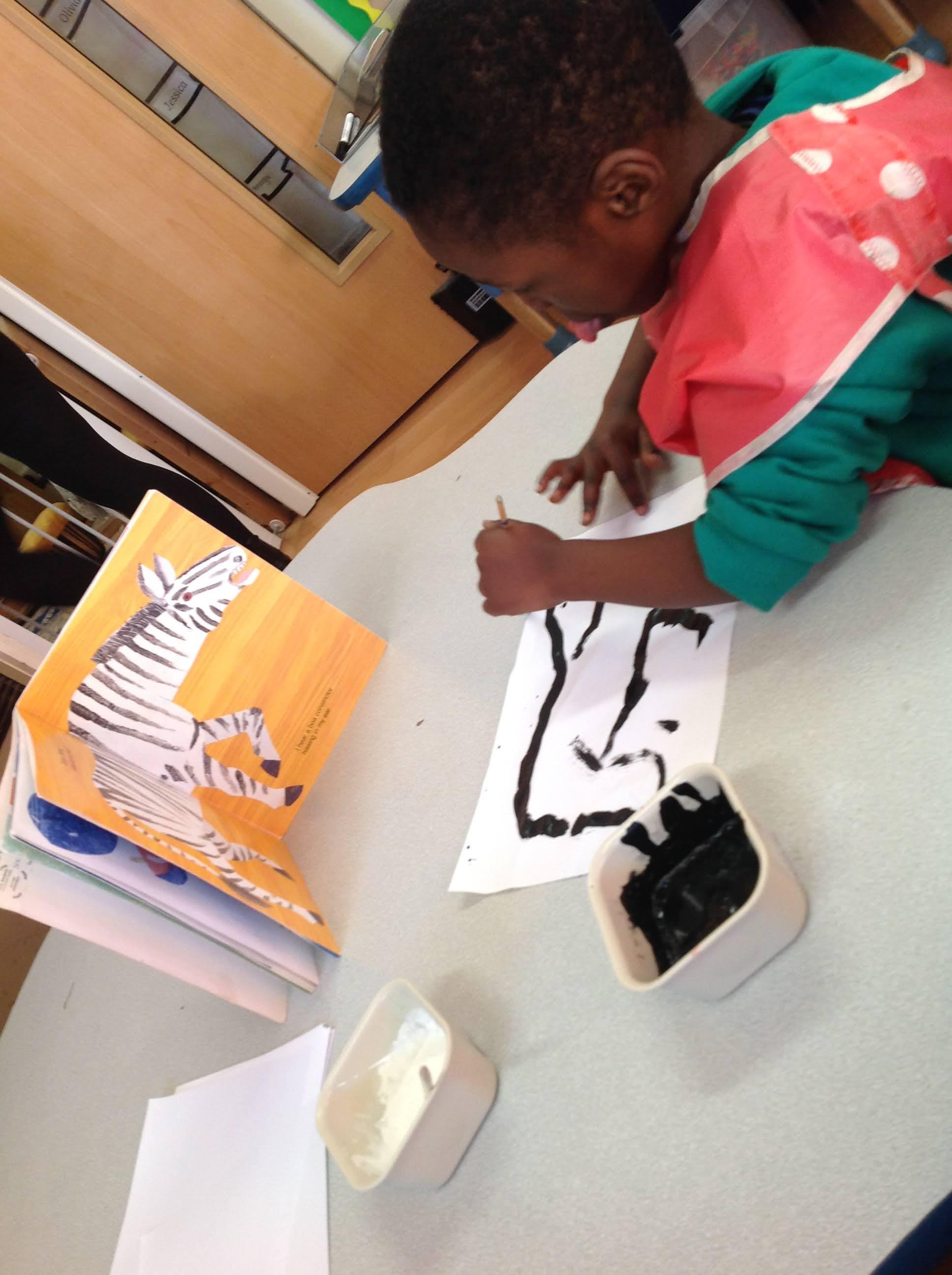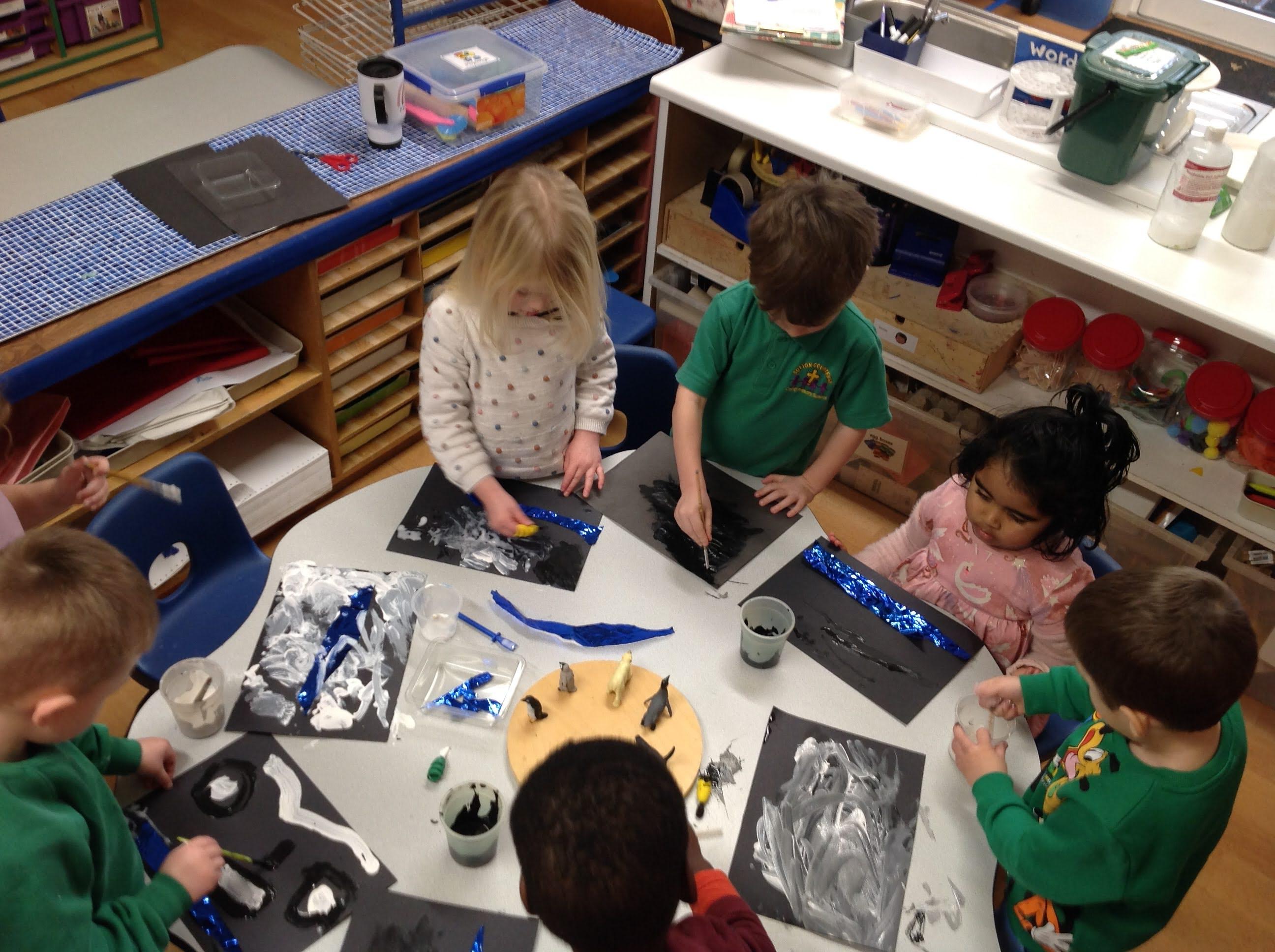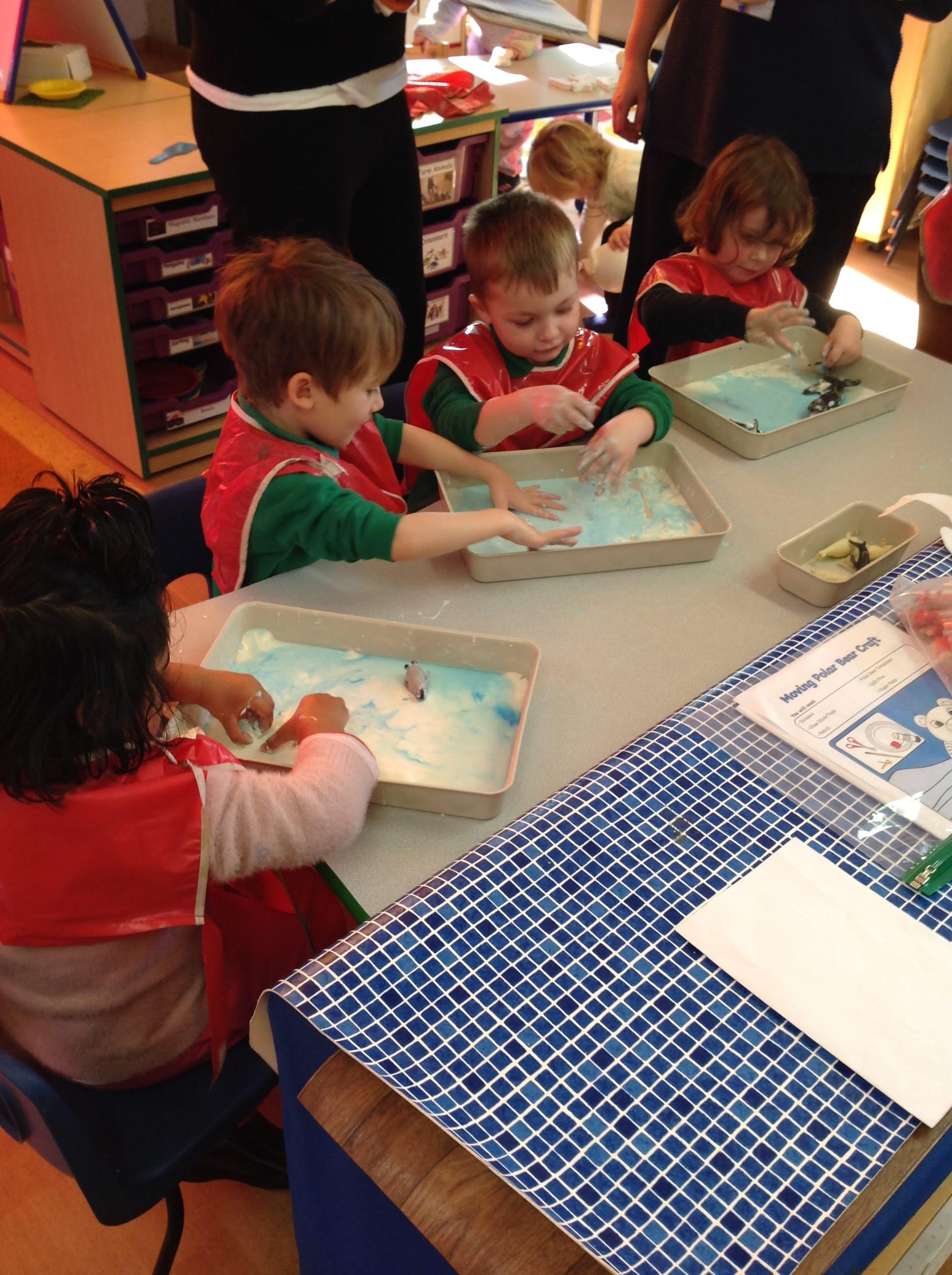 This week we have been reading the book Polar Bear, Polar Bear What Do You Hear? By Bill Martin and Eric Carle. Our brick pit became the Polar Bear's cave and we went fishing under the Arctic ice too. The Barn Owls have been learning facts about Polar Bears and enjoyed pretending to be bears wearing the bear ears we made. In the book there are lots of different animals and descriptions of the sounds they make. The children were able to identify the animals from just the sounds. They have made amazing masks of the the animals from the story.