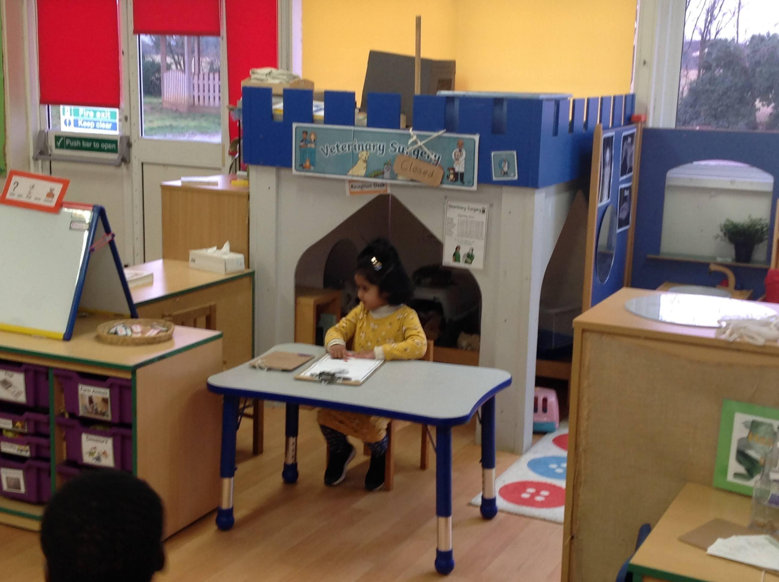 Our home corner became a vets. The Barn Owls were great vets looking after and checking the animals. The receptionists were very efficient too. Everyone got an appointment! We have also been zookeepers looking after the animals outside and making sure they were fed.