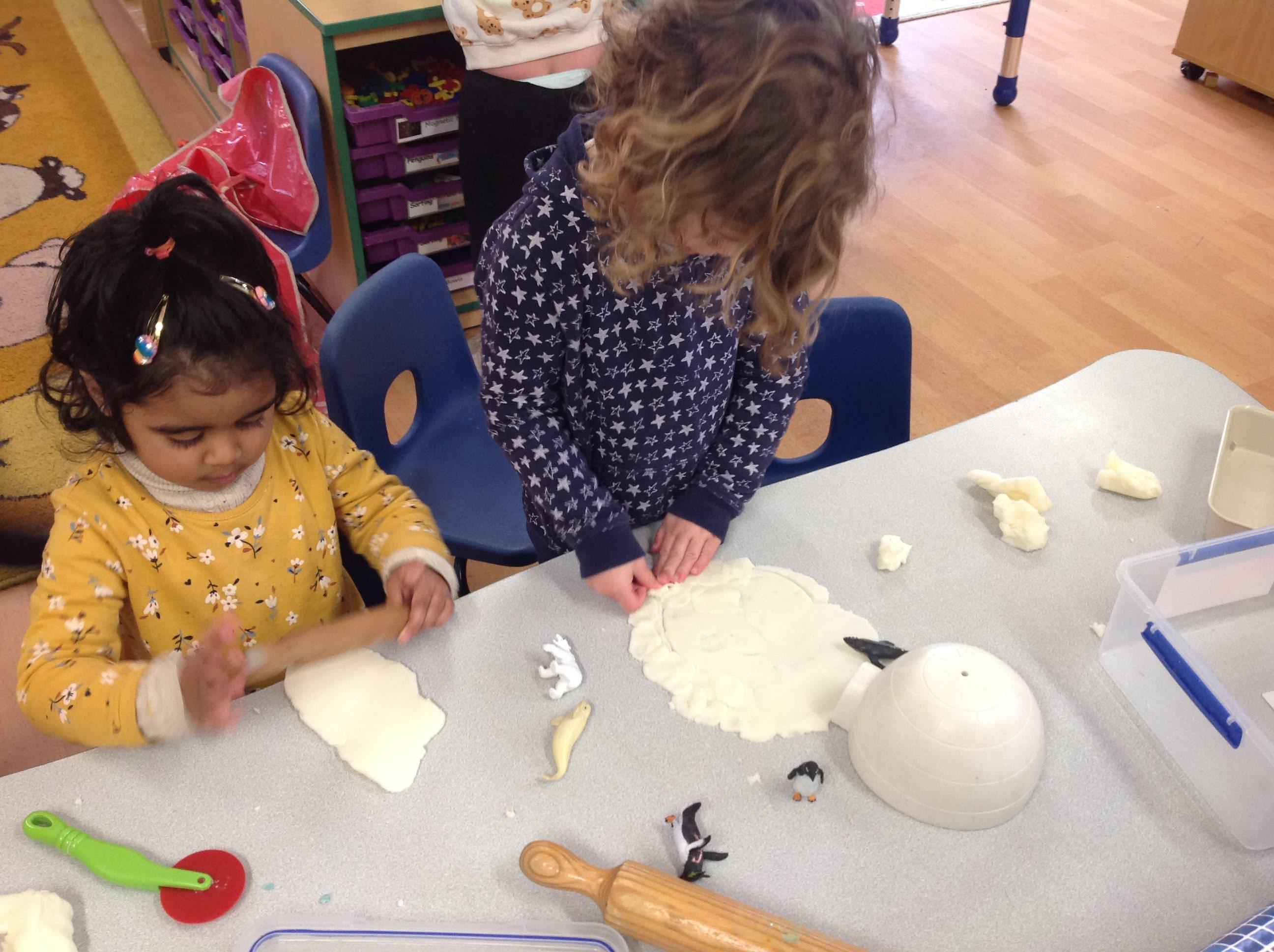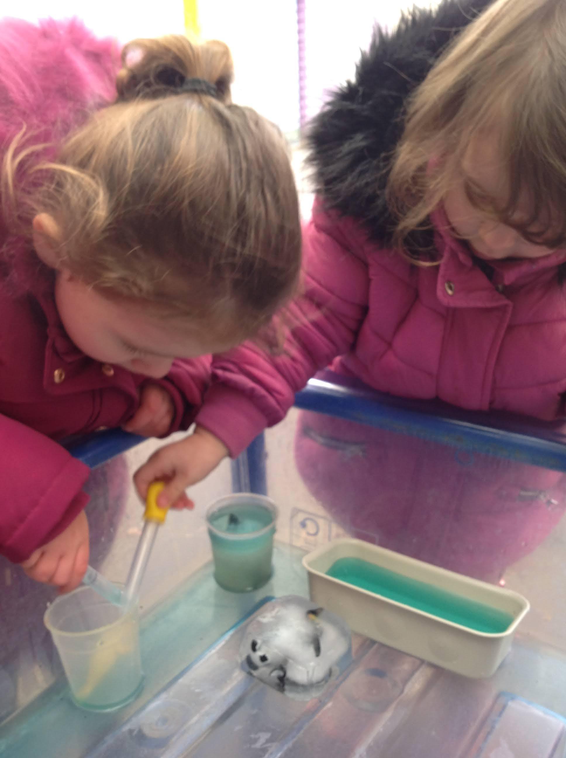 We wore our Gruffalo masks as we stepped out the story of The Gruffalo's Child. The Barn Owls have been exploring how to make the ice cubes melt to get the penguins out.
