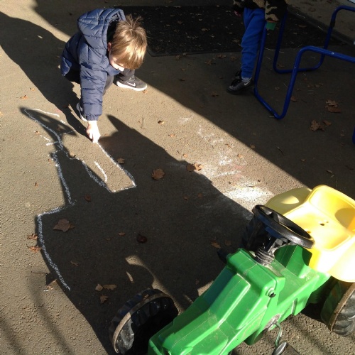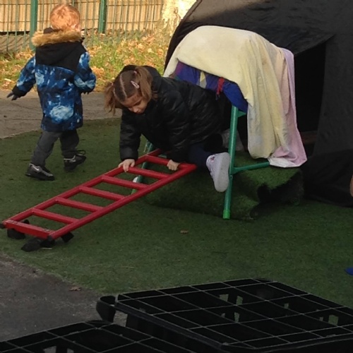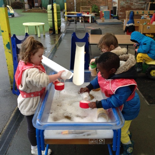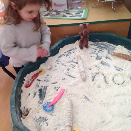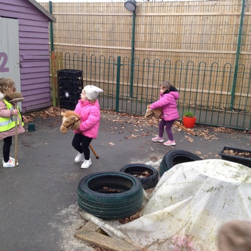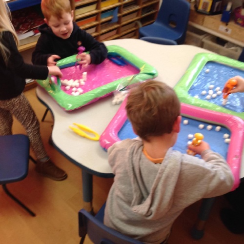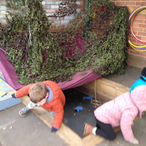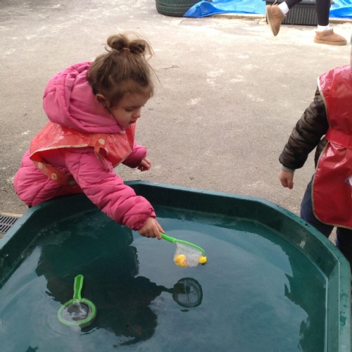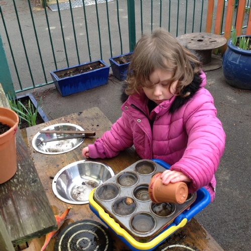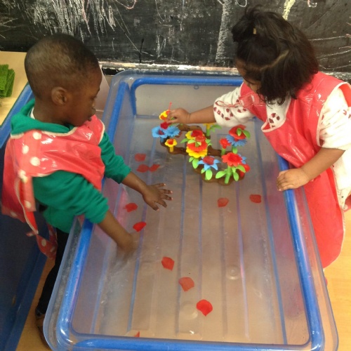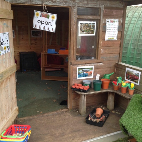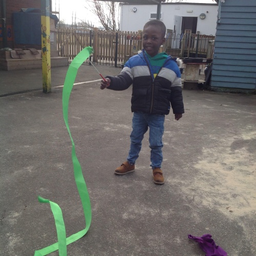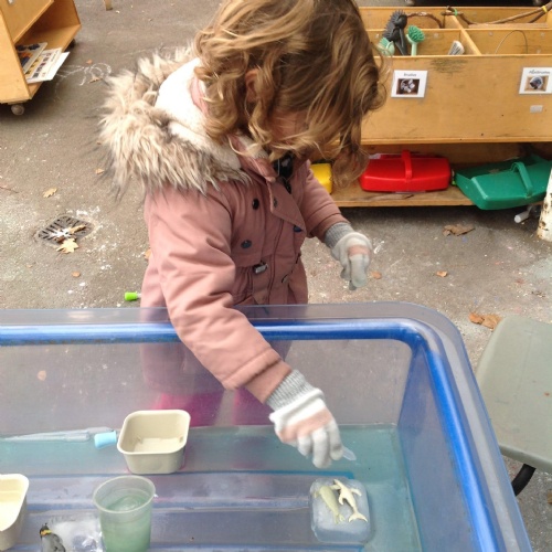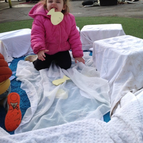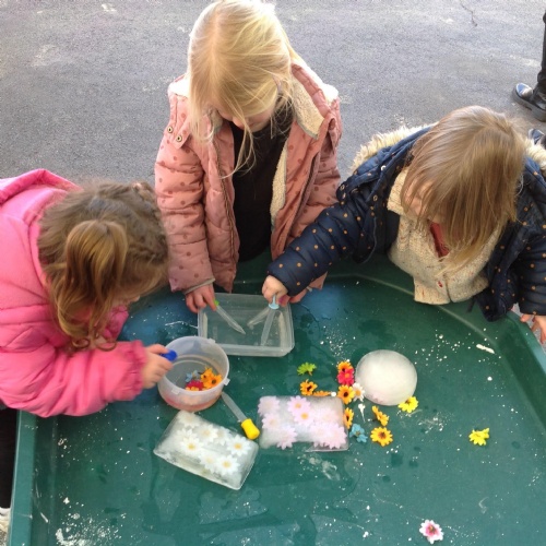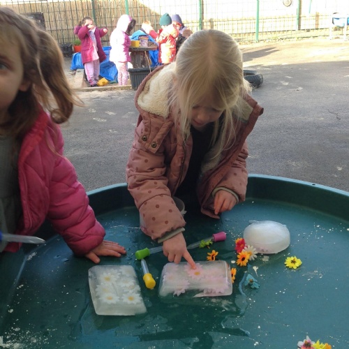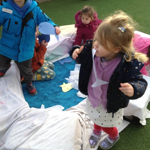 The Wendy House is a garden center this week and it has been very busy. Outside the Barn Owls have been very active, playing football, balancing on the apparatus and bucket stilts, making shape patterns with the ribbon sticks on a windy day, and fishing flowers from ice!
