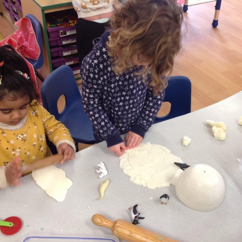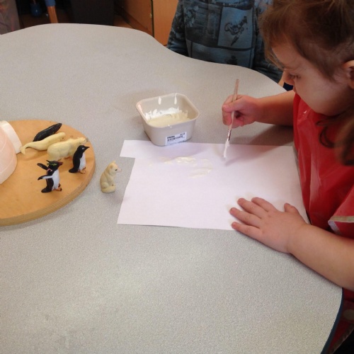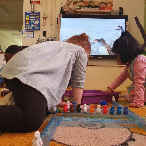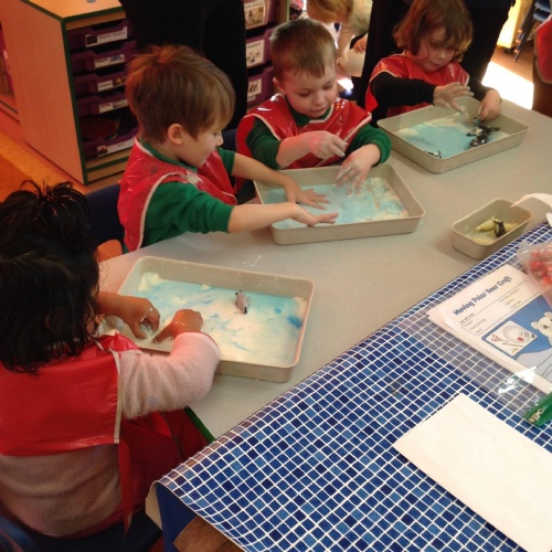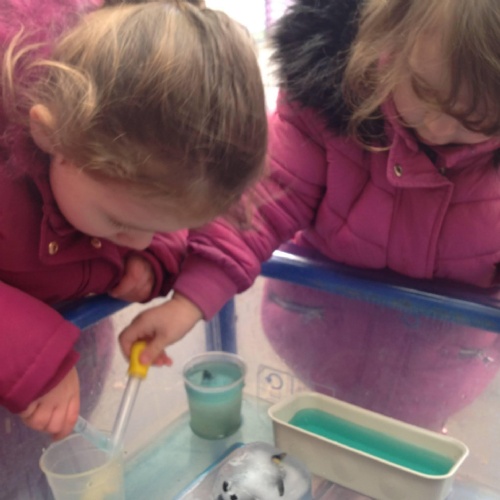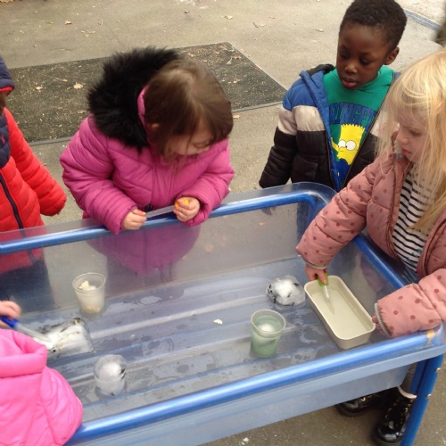 We wore our Gruffalo masks as we stepped out the story of The Gruffalo's Child. The Barn Owls have been exploring how to make the ice cubes melt to get the penguins out.