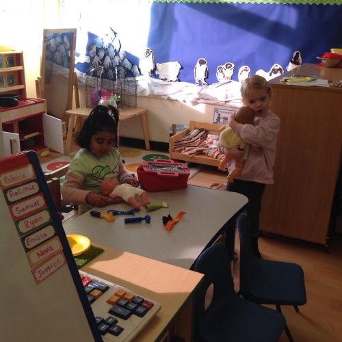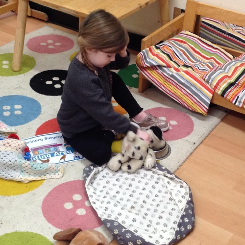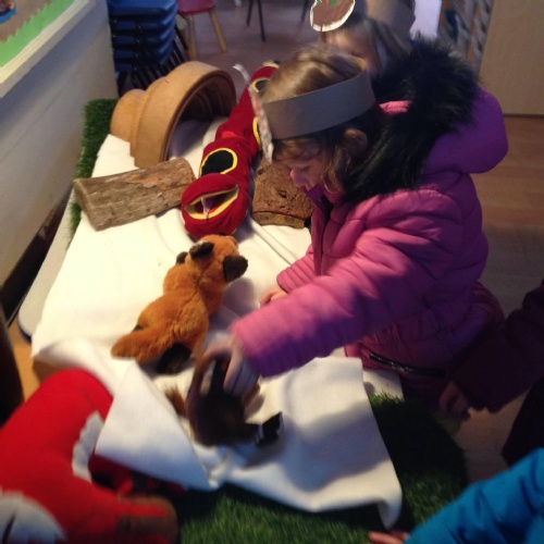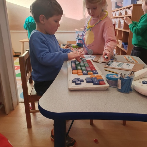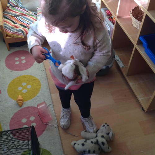 Our home corner became a vets. The Barn Owls were great vets looking after and checking the animals. The receptionists were very efficient too. Everyone got an appointment! We have also been zookeepers looking after the animals outside and making sure they were fed.