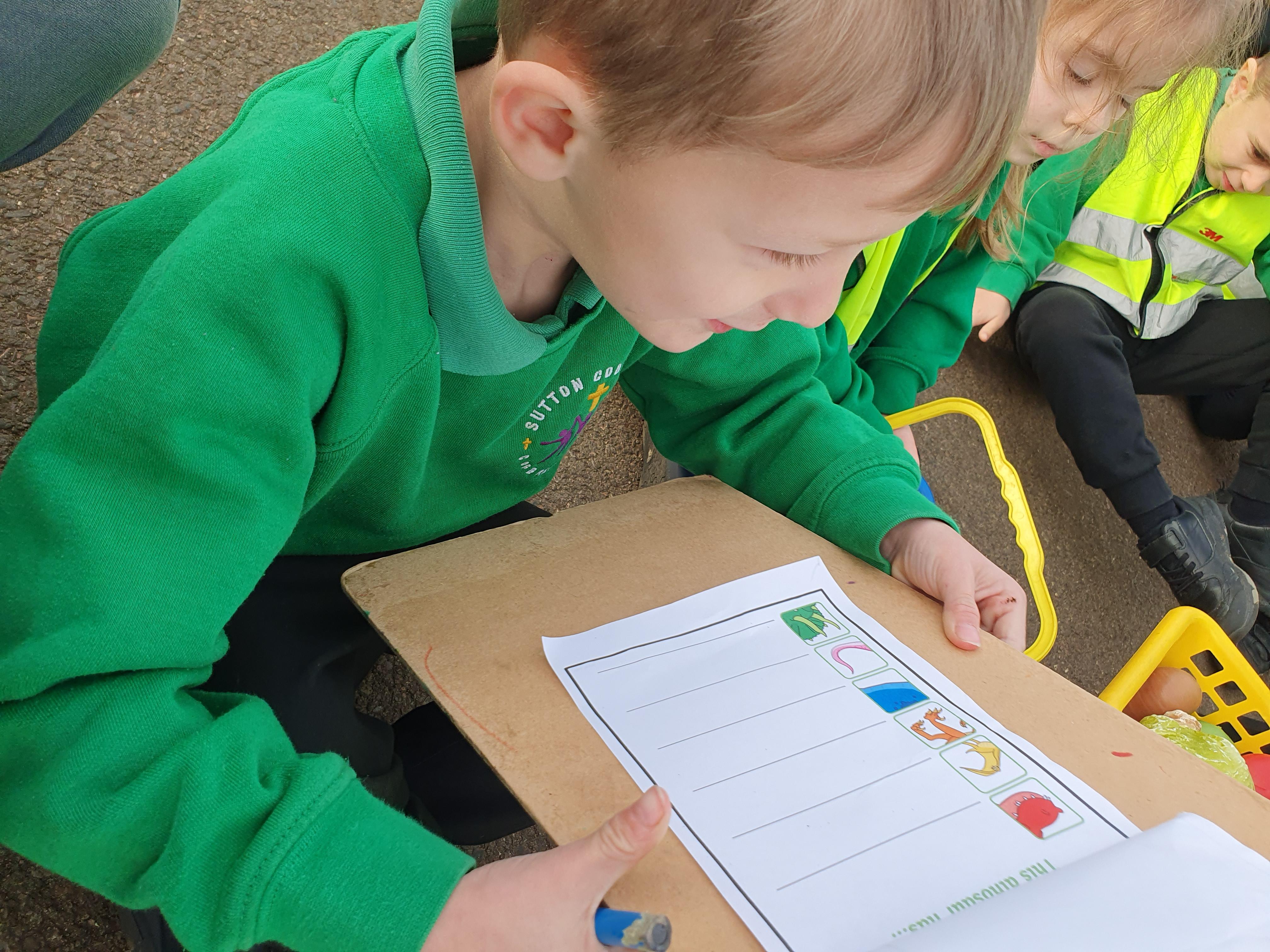 We went on a dinosaur hunt today (we pretended there were real dinosaurs). We planned what we needed . . .