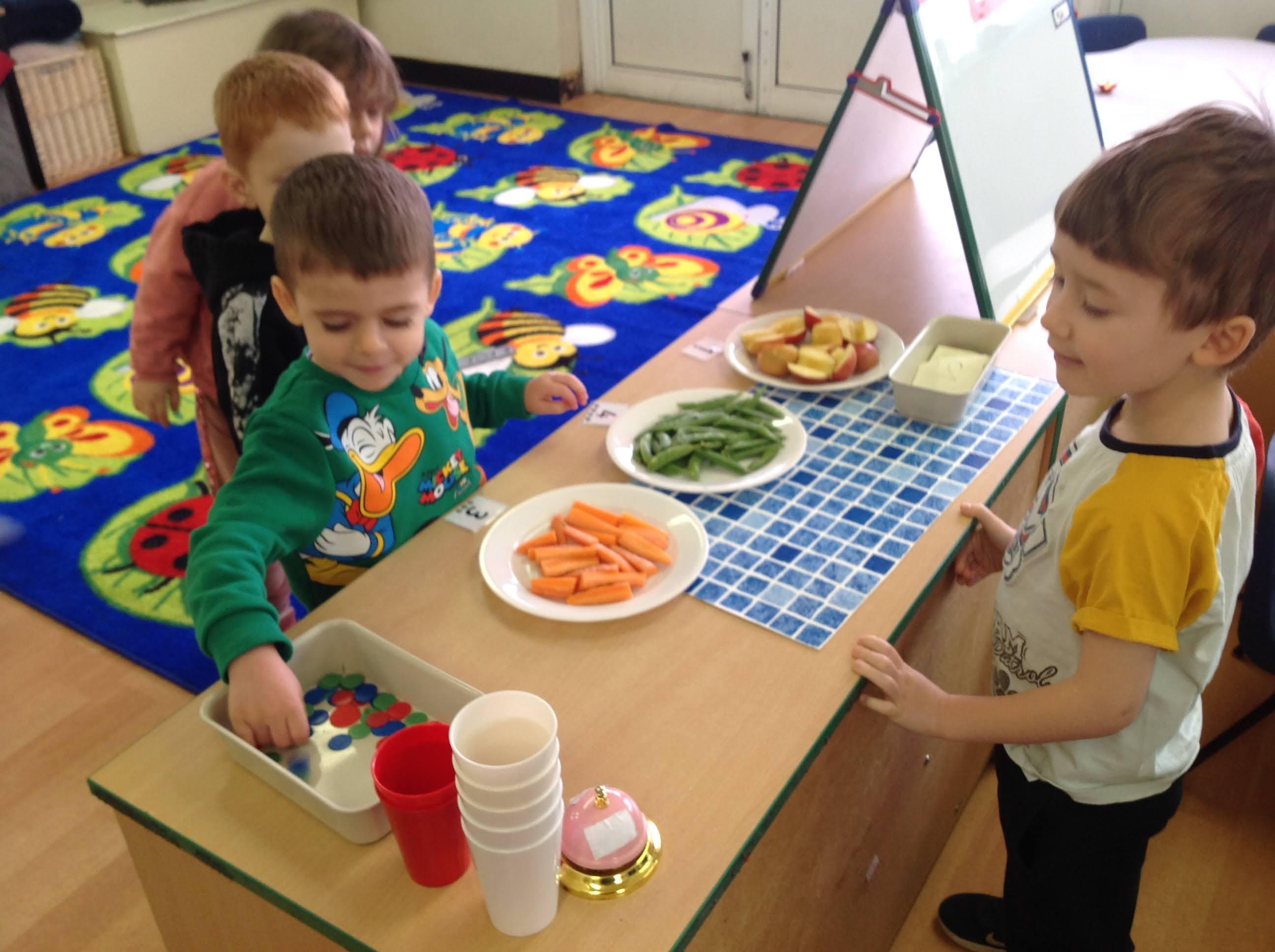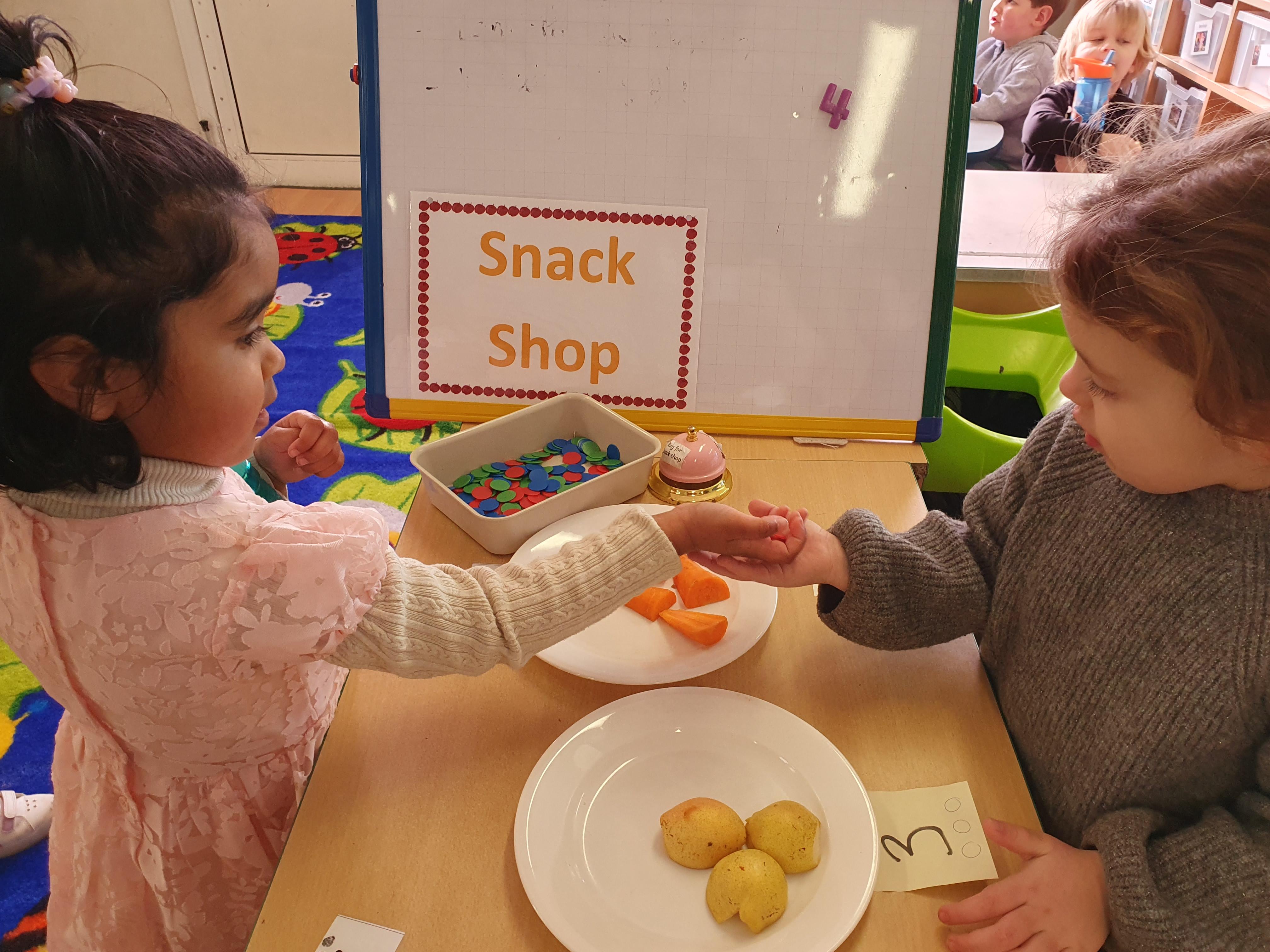 During snack time, we now have the snack shop where children take it in turns to be the shopkeeper and choose a price for the fruit pieces and their friends have to count the counters needed to 'pay' for the fruit. The Barn Owls have been fantastic at turn taking and counting.