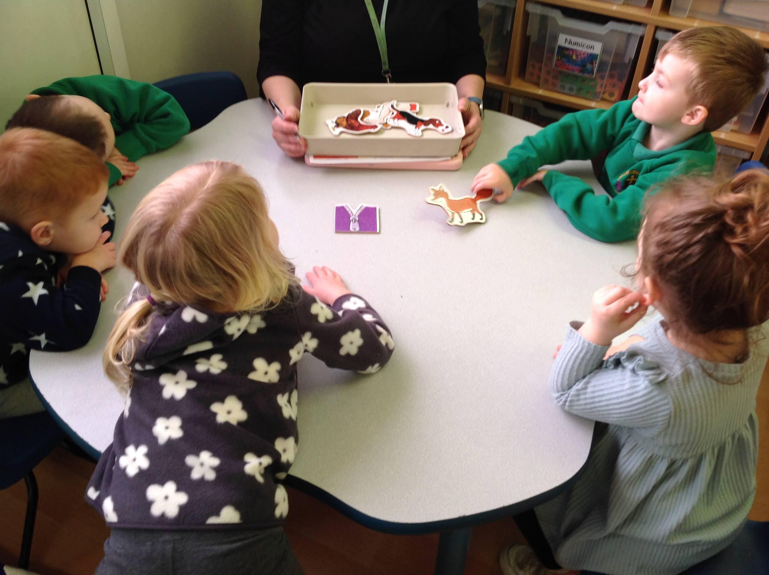 This week we have also used the musical instruments to create music that we thought the beanstalk might grow to. The Barn Owls have also been showing how great their listening skills have become, as they took it in turns to sit in the middle of the circle wearing a blindfold and had to guess who they could hear in the game. They have also been using these listening skills as we develop our lettersounds in phonics, and blending sounds together.