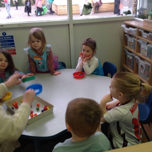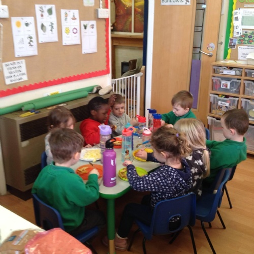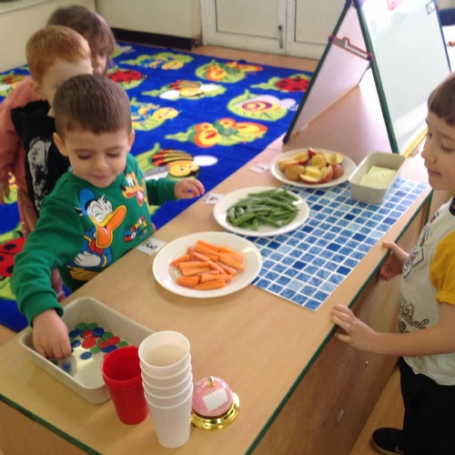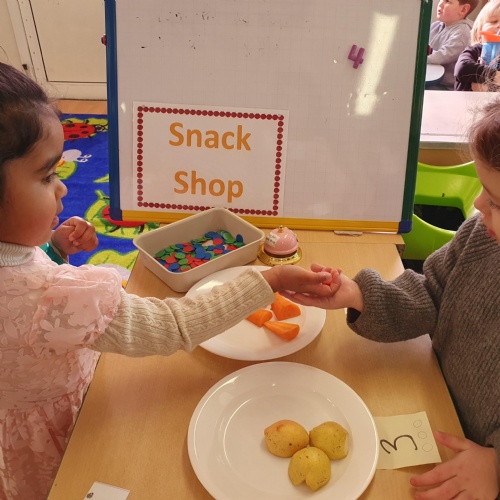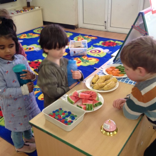 During snack time, we now have the snack shop where children take it in turns to be the shopkeeper and choose a price for the fruit pieces and their friends have to count the counters needed to 'pay' for the fruit. The Barn Owls have been fantastic at turn taking and counting.