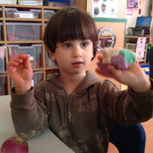 This week we have been reading the story of The Enormous Turnip. We made our own turnips from playdough. We having been sorting vegetables to print pictures and make patterns too. The Barn Owls have worked together to try and pull an enormous turnip by pulling the rope as a team. There was also turnip soup making in the water tray!