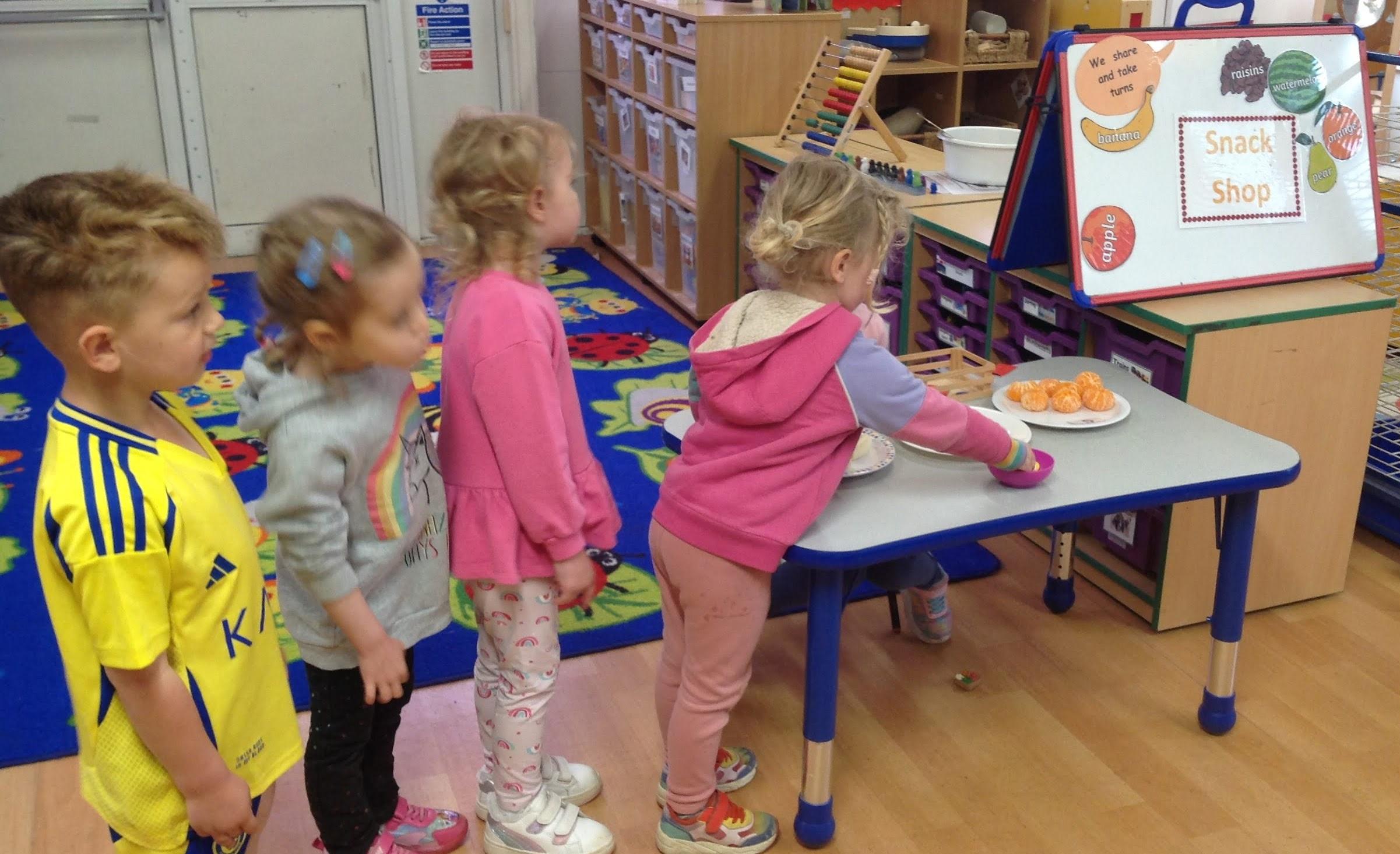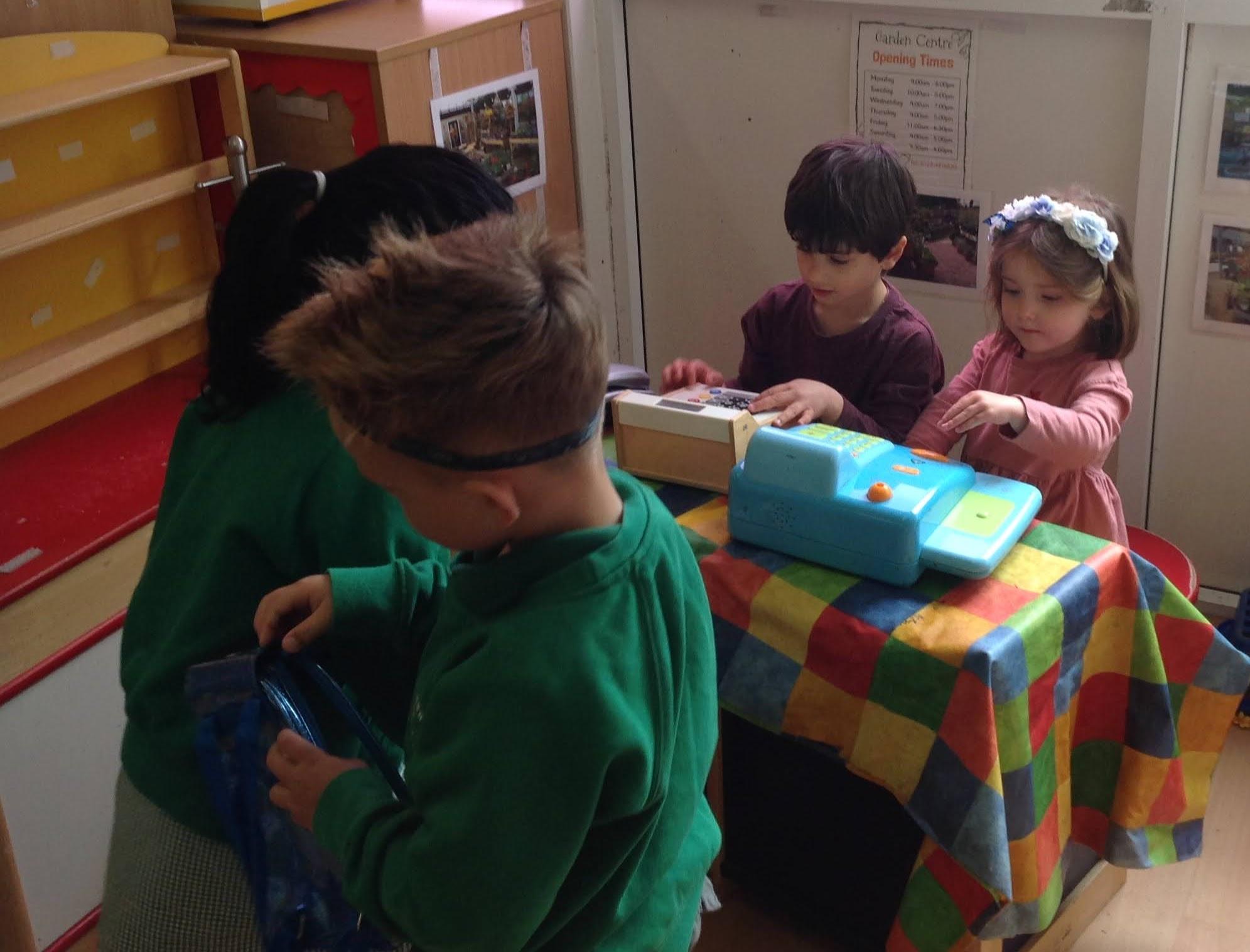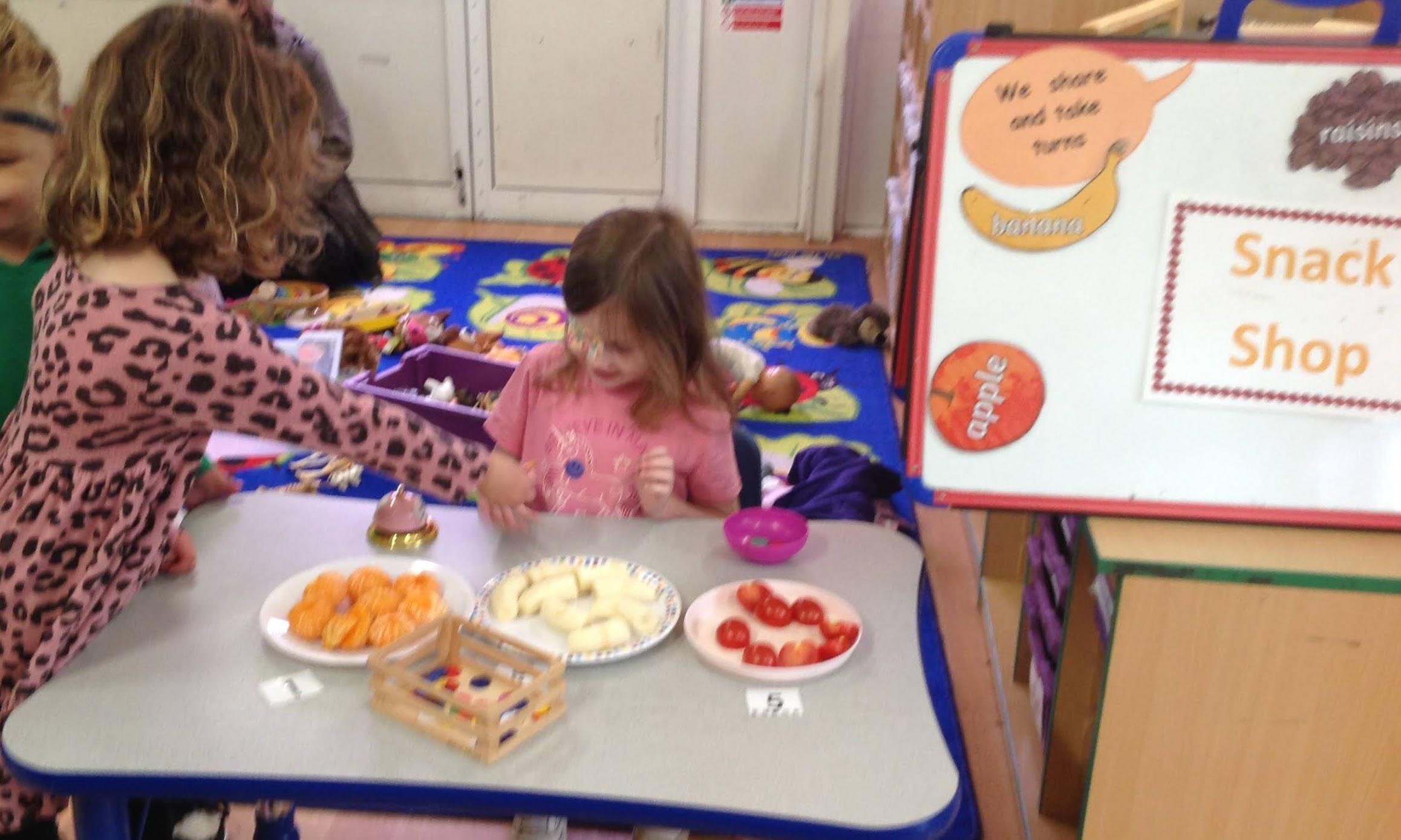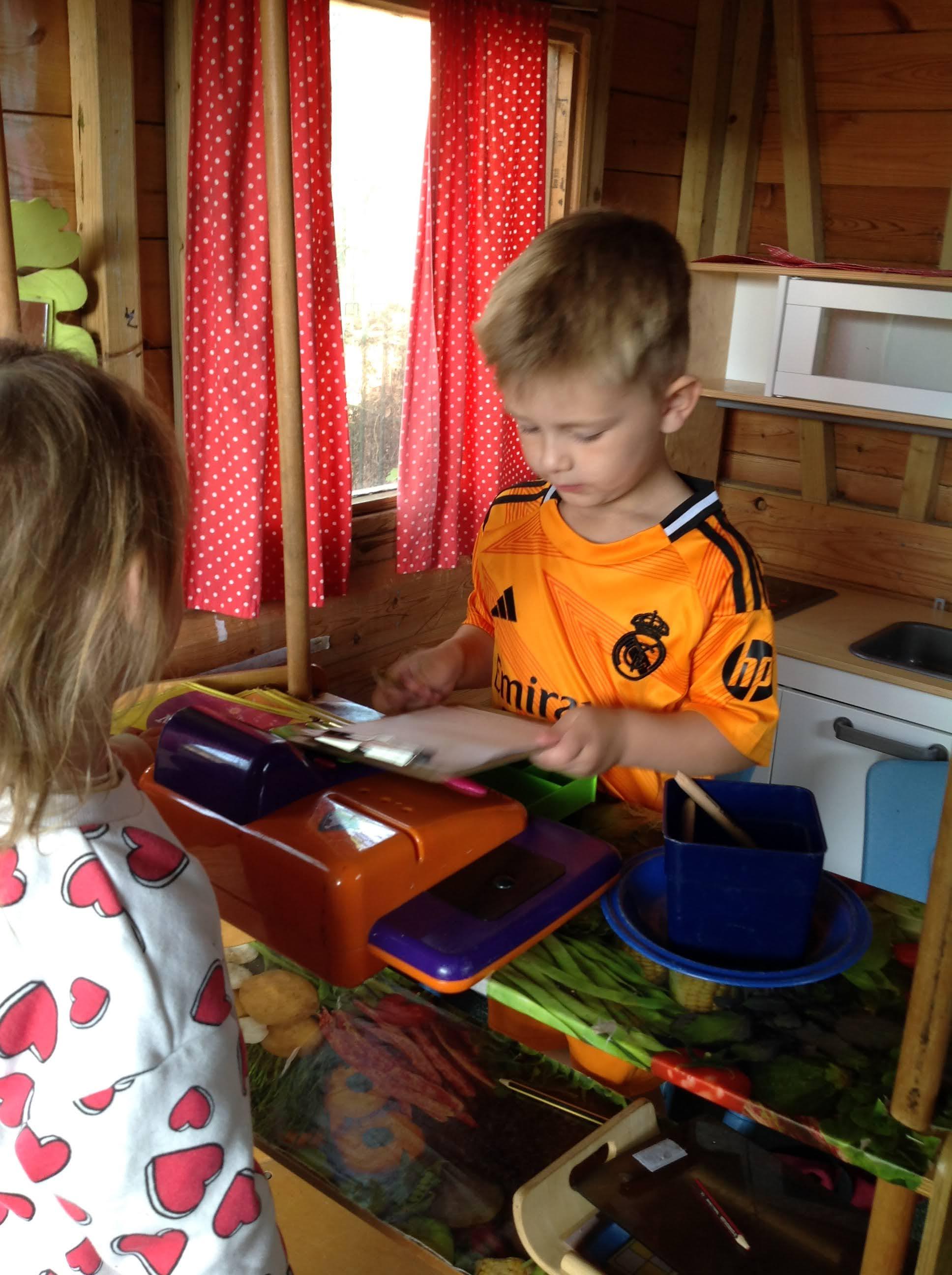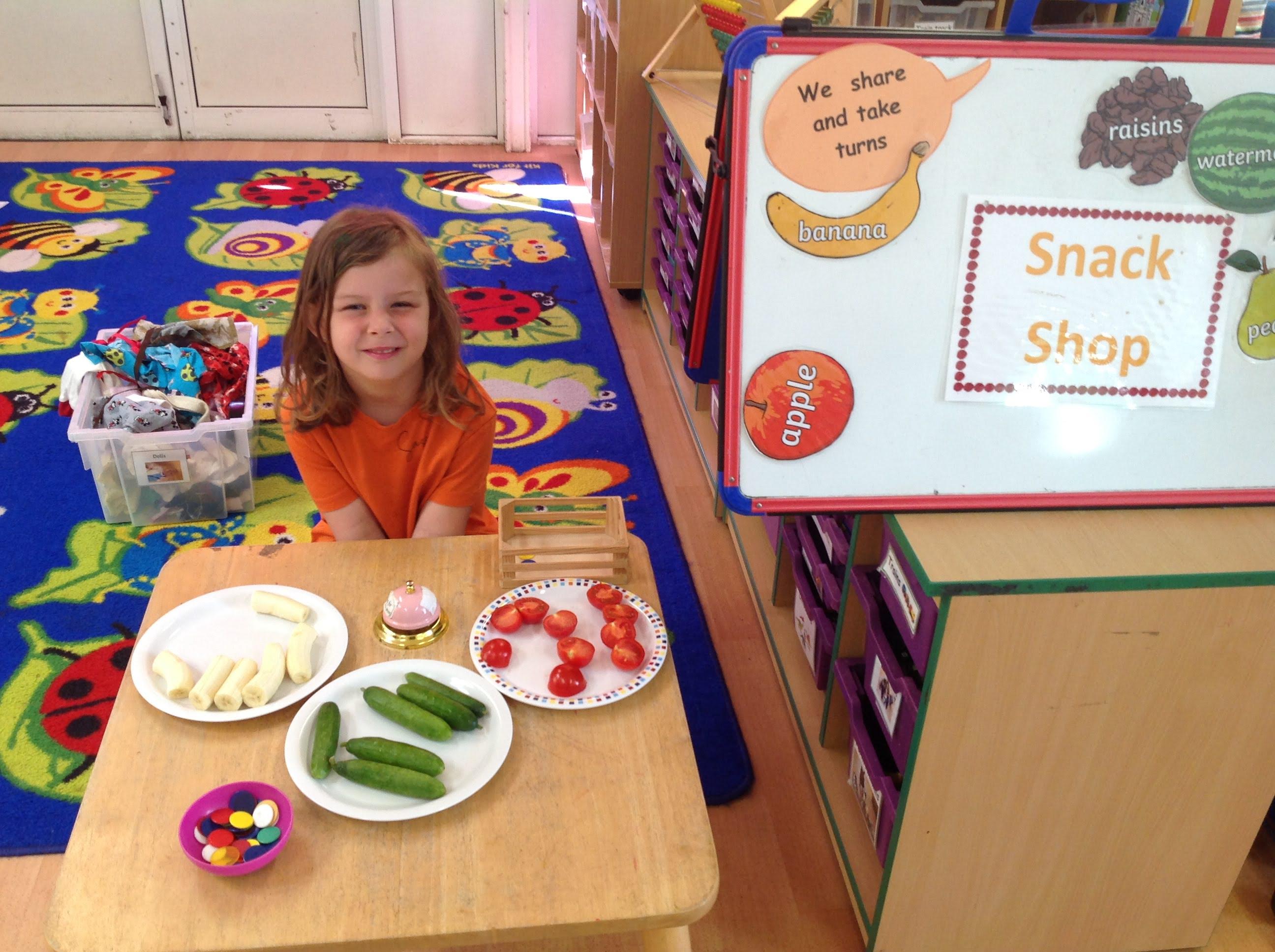 Inside the classroom our homecorner became a garden centre and the children have shown great customer service skills! The snack shop allows children to take turns and practice their counting. The Barn Owls are always polite, saying 'please' and 'thank you'.