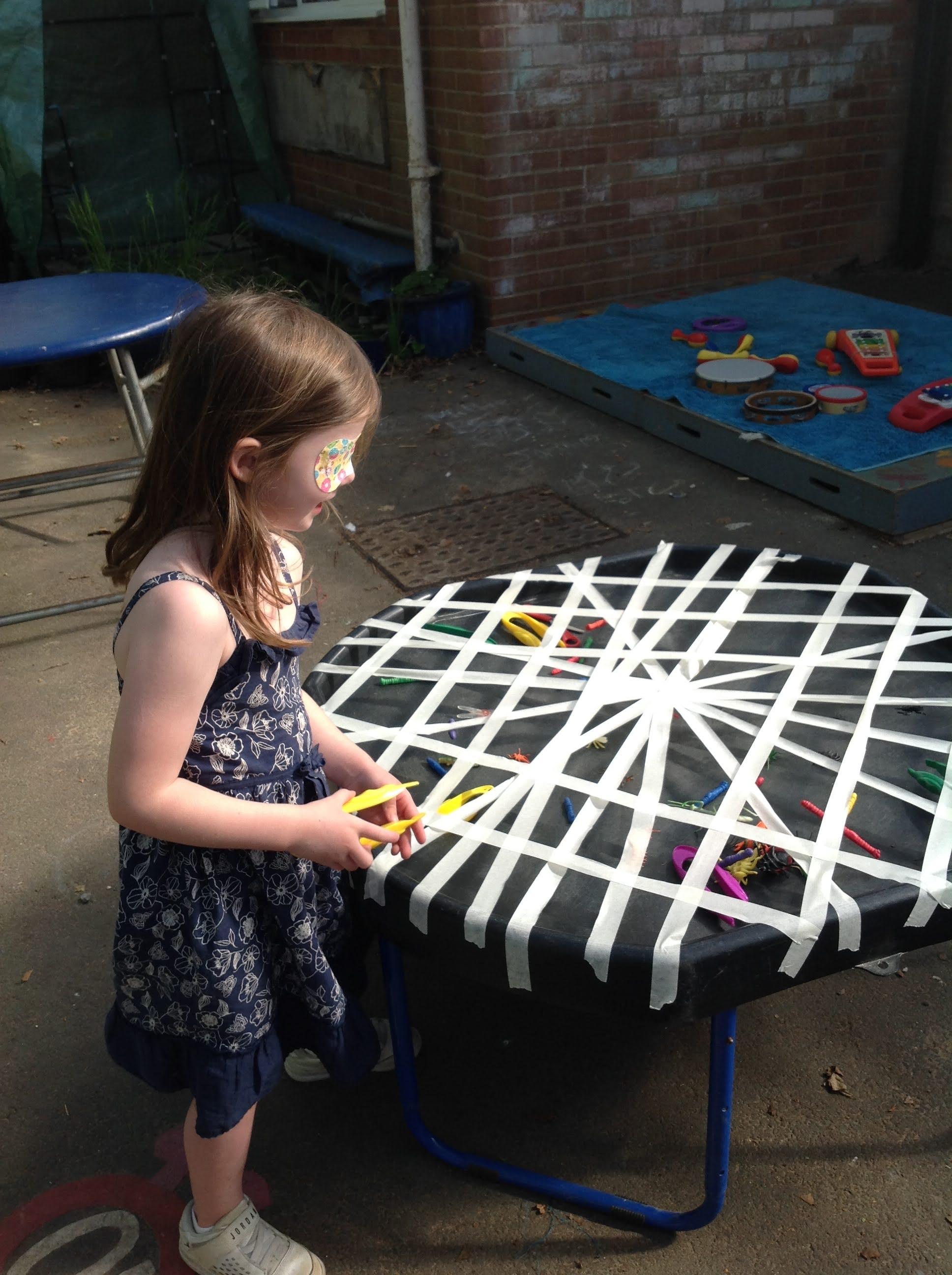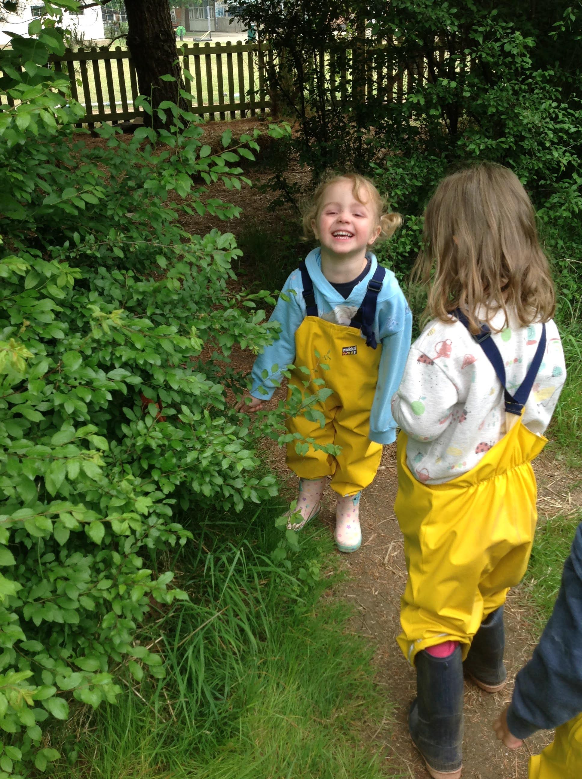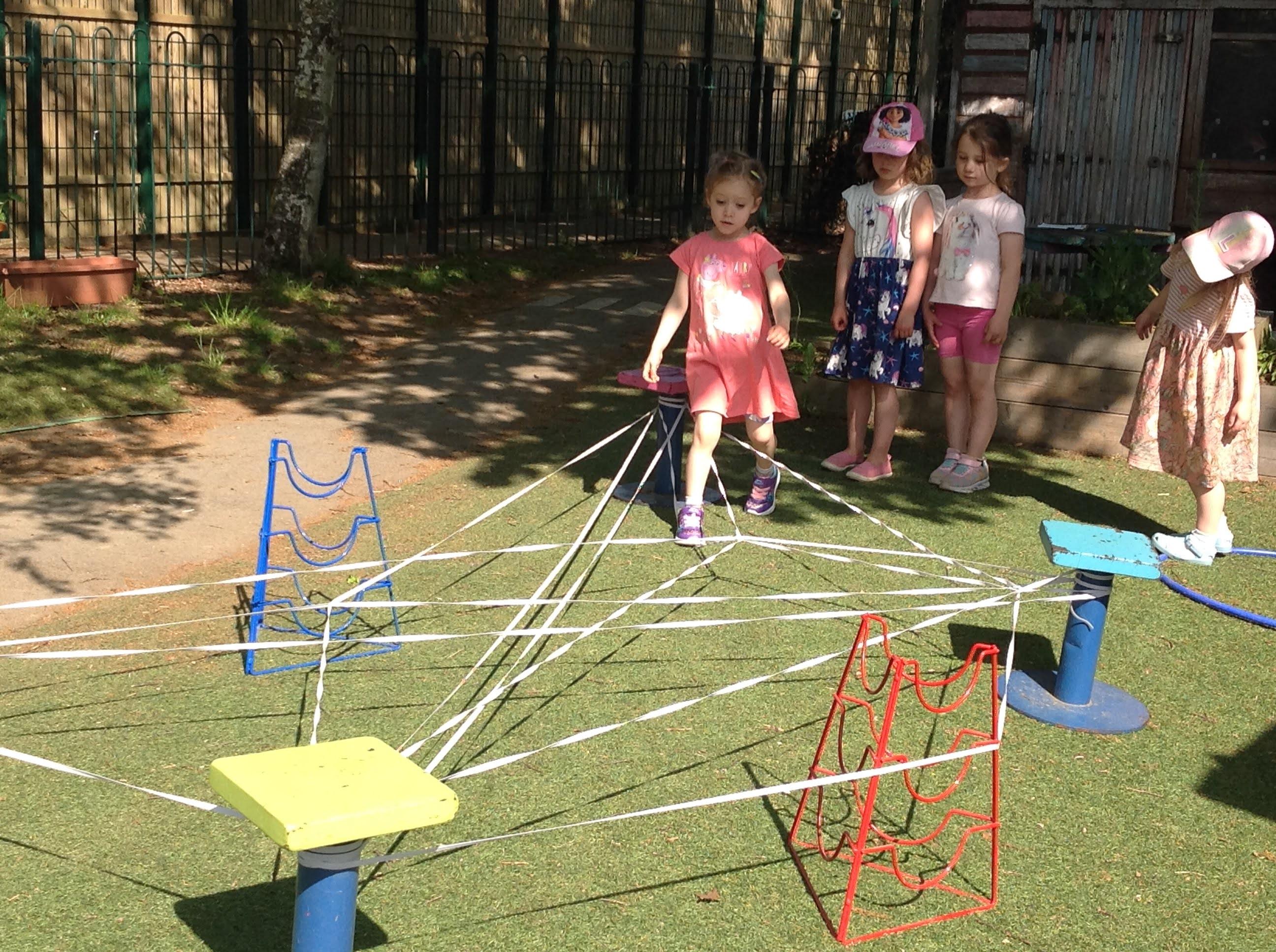 This week we have been reading The Very Busy Spider by Eric Carle. We have been very busy making our own handprint spiders and weaving our plate webs. In the garden we made a large elastic web that we could explore moving across in different ways. The sand pit has been very popular in the sunshine. We have also been on a minibeast hunt around the garden.