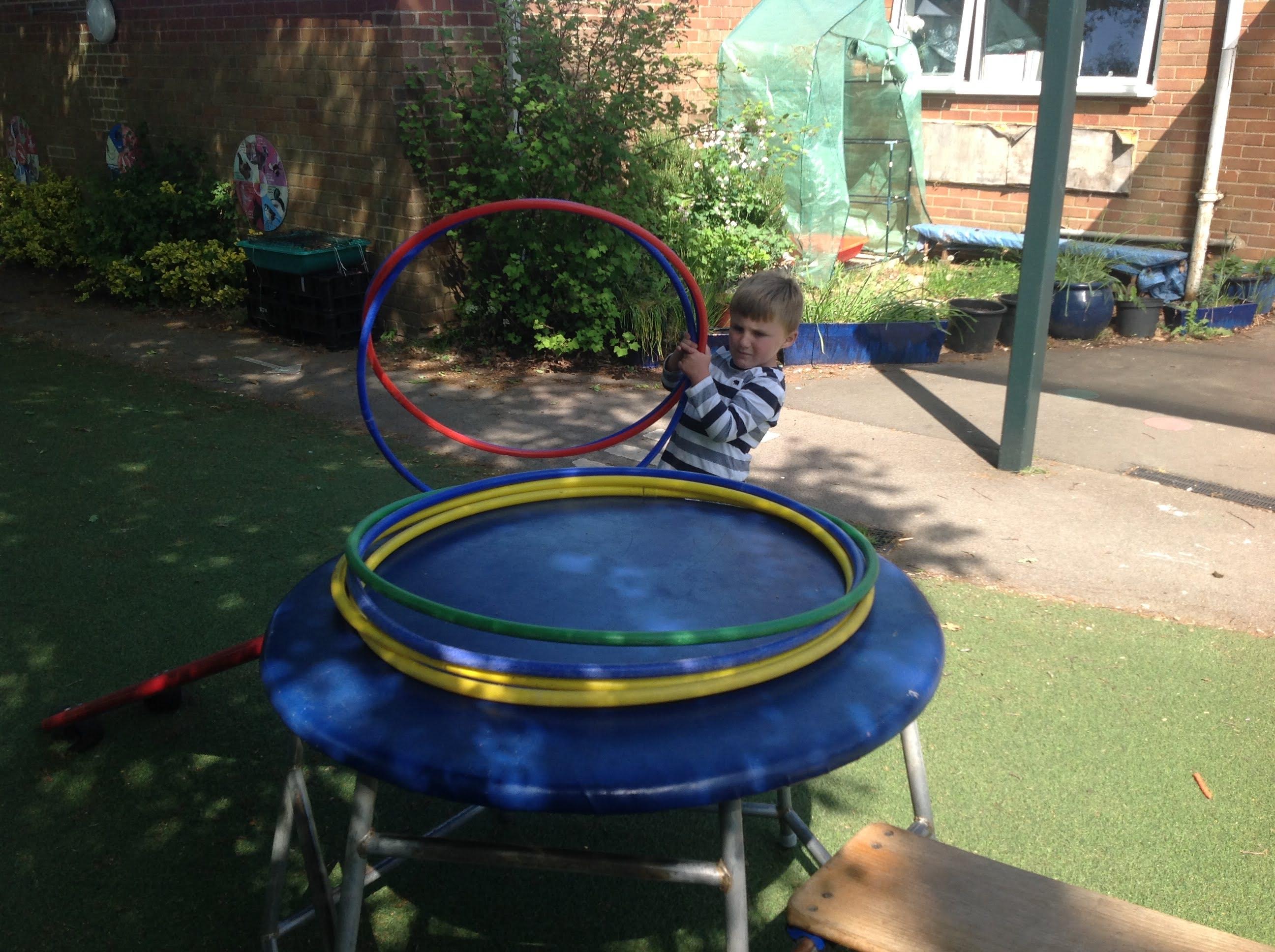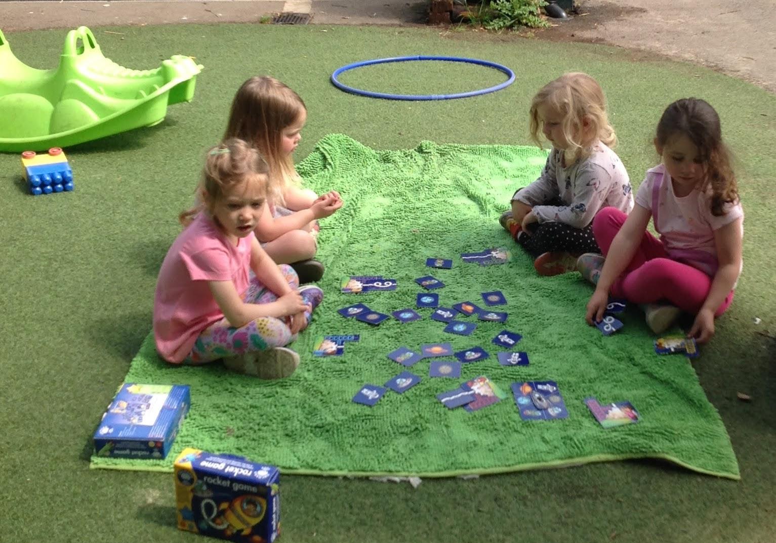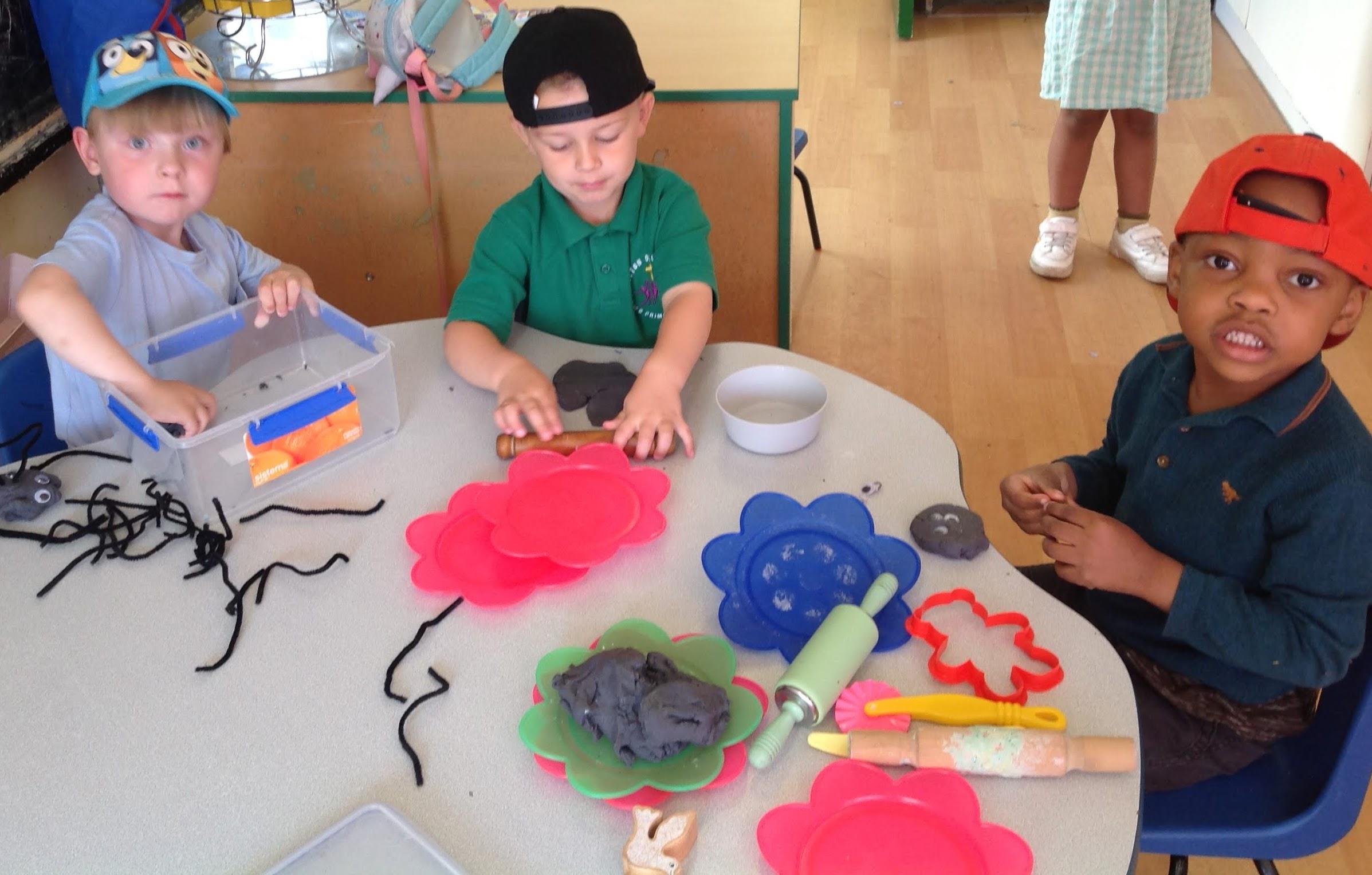 This week we have been reading The Very Busy Spider by Eric Carle. We have been very busy making our own handprint spiders and weaving our plate webs. In the garden we made a large elastic web that we could explore moving across in different ways. The sand pit has been very popular in the sunshine. We have also been on a minibeast hunt around the garden.