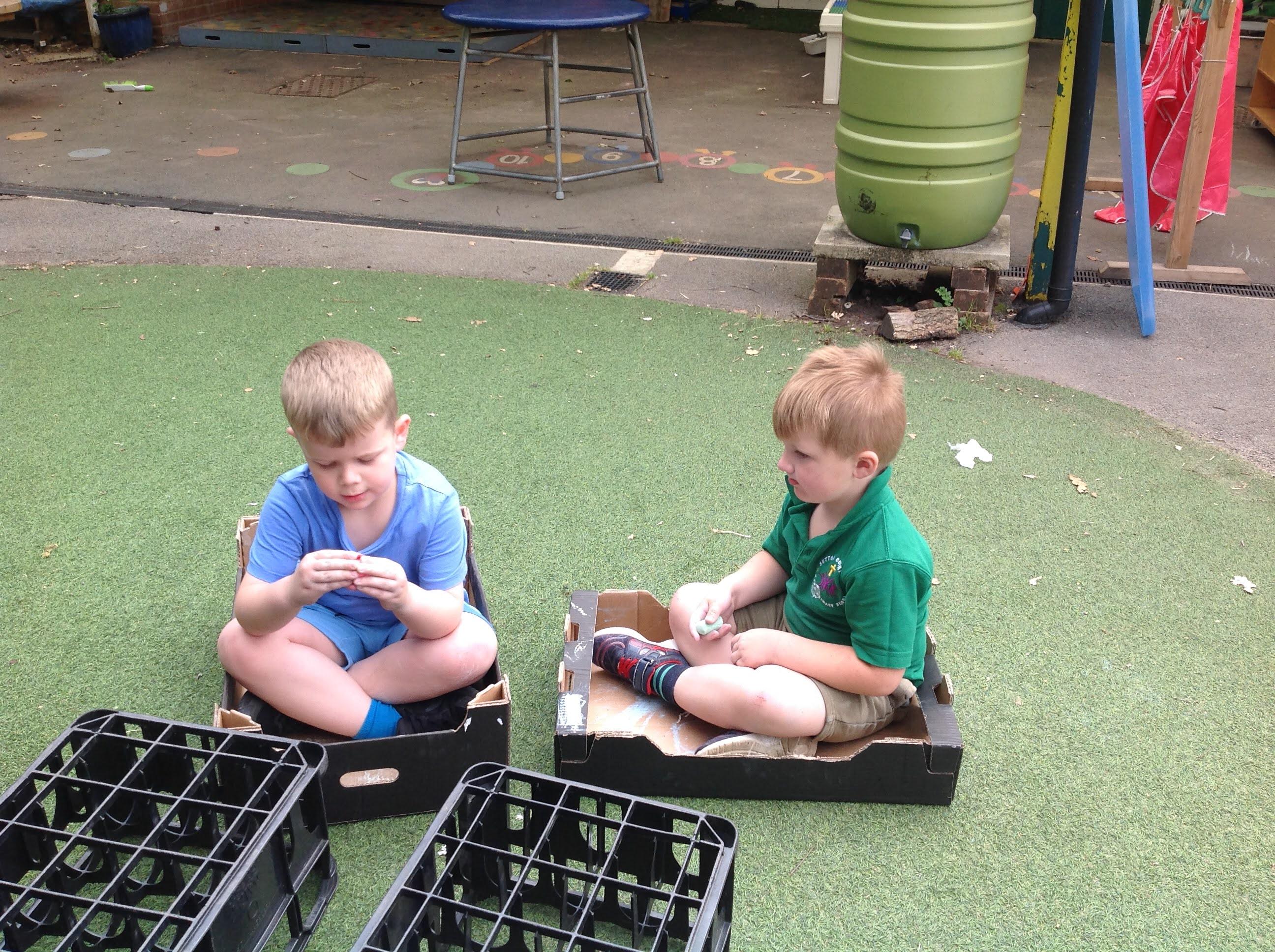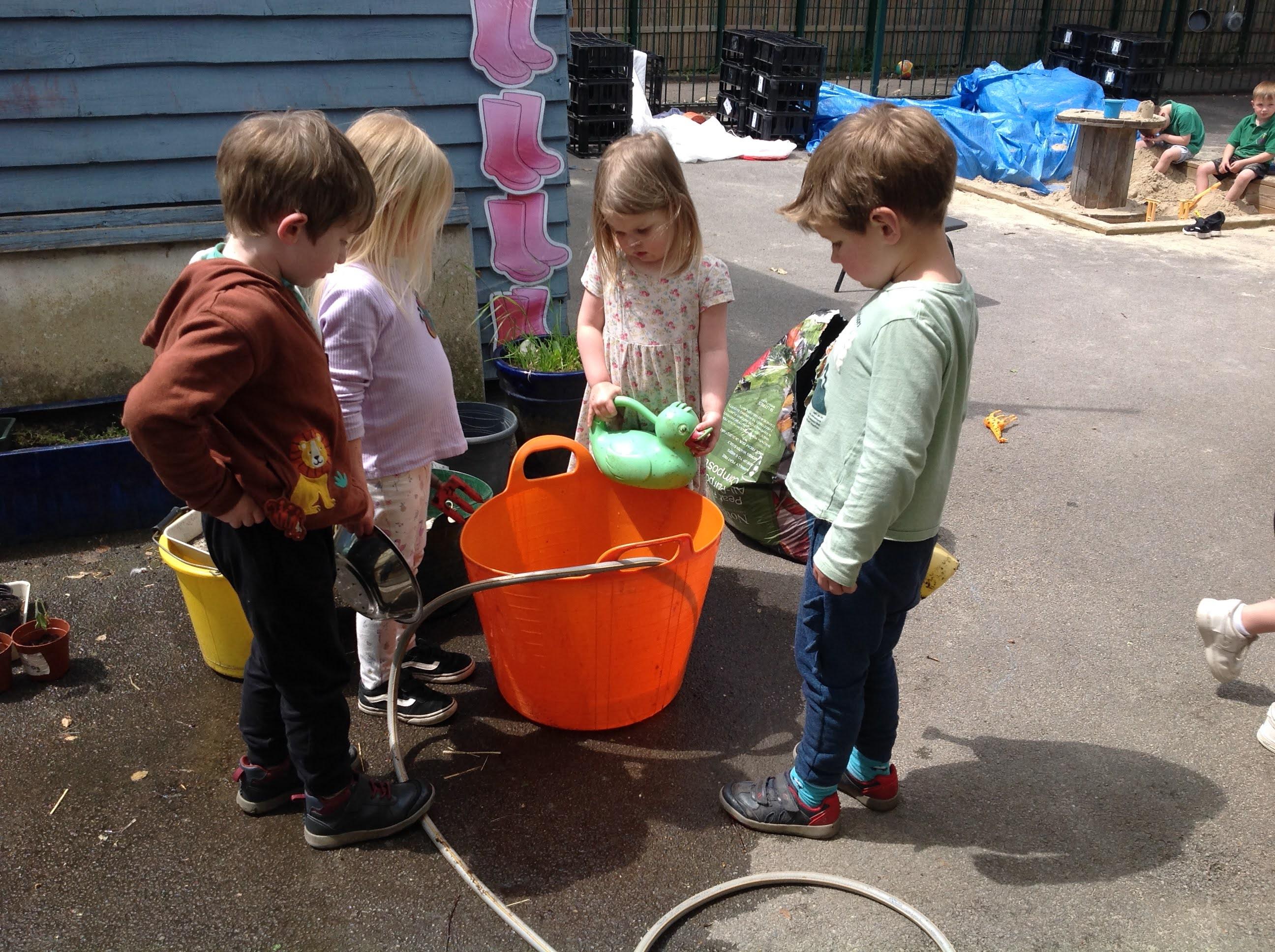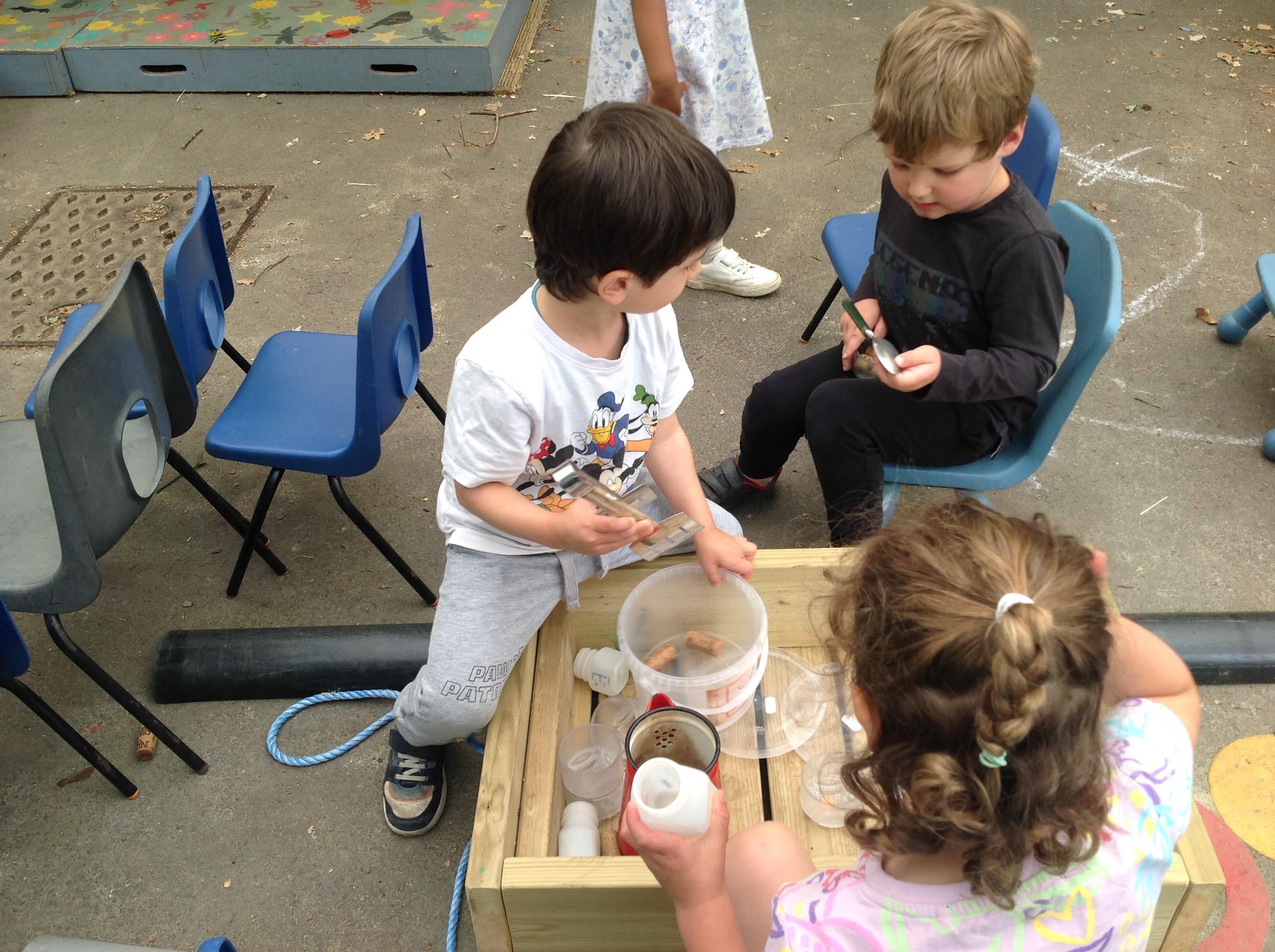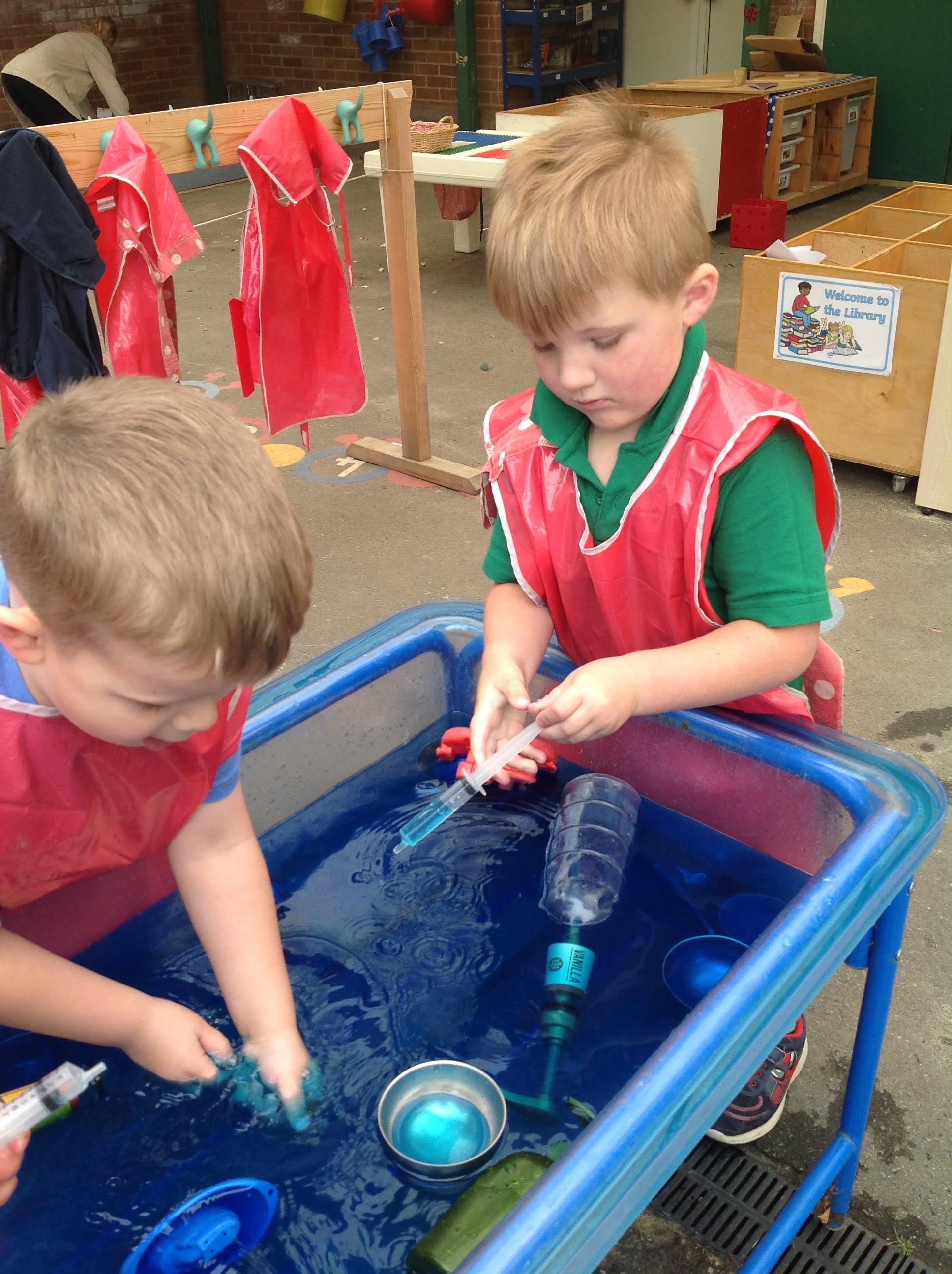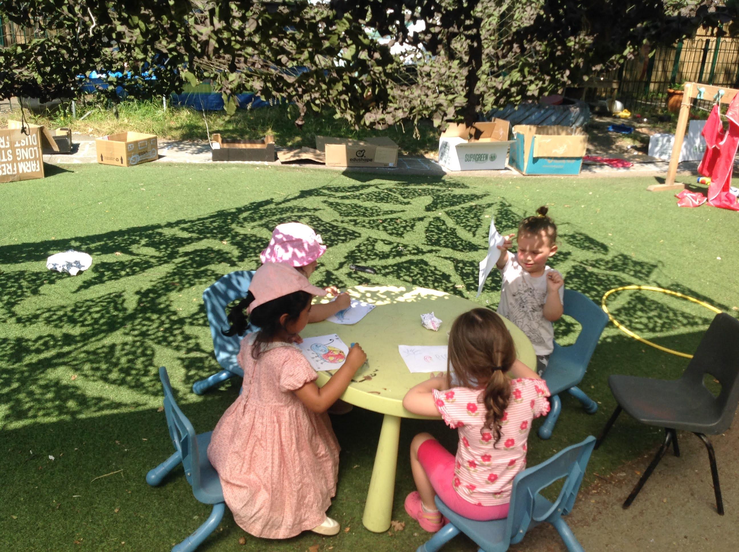 This week we have been reading the story The Train Ride by June Crebbin. We have been making trains and tracks with a variety of resources. There have also been creative ways to cool down in the heat from putting our feet in the tuff tray of water and running under the jets of water from the hose. You may have noticed that our garden kitchen has been moved about, allowing it to be easier to use water in it. There are four new water containers to hold the different colour water for mixing. All the children have enjoyed spending time in there this week.