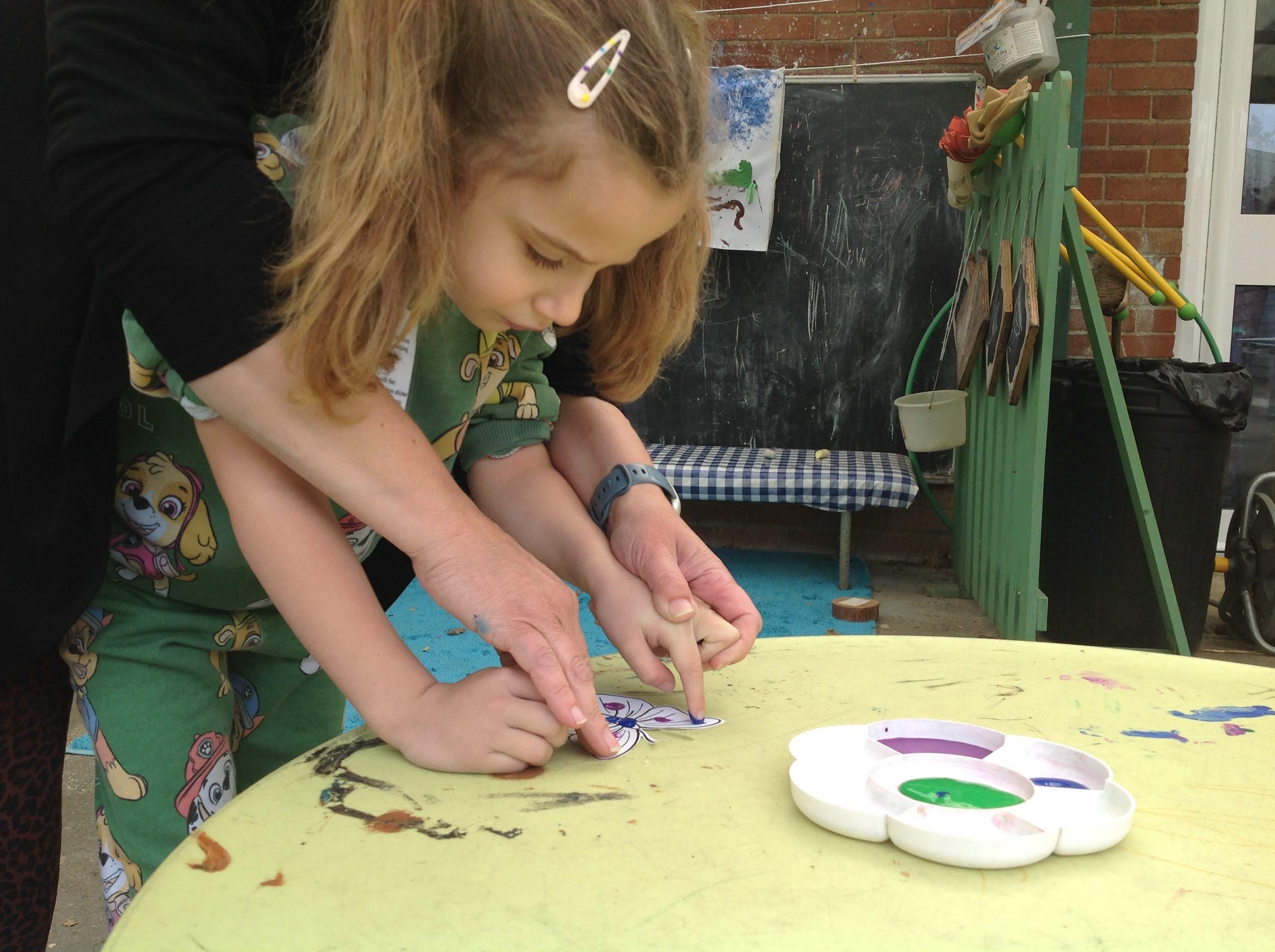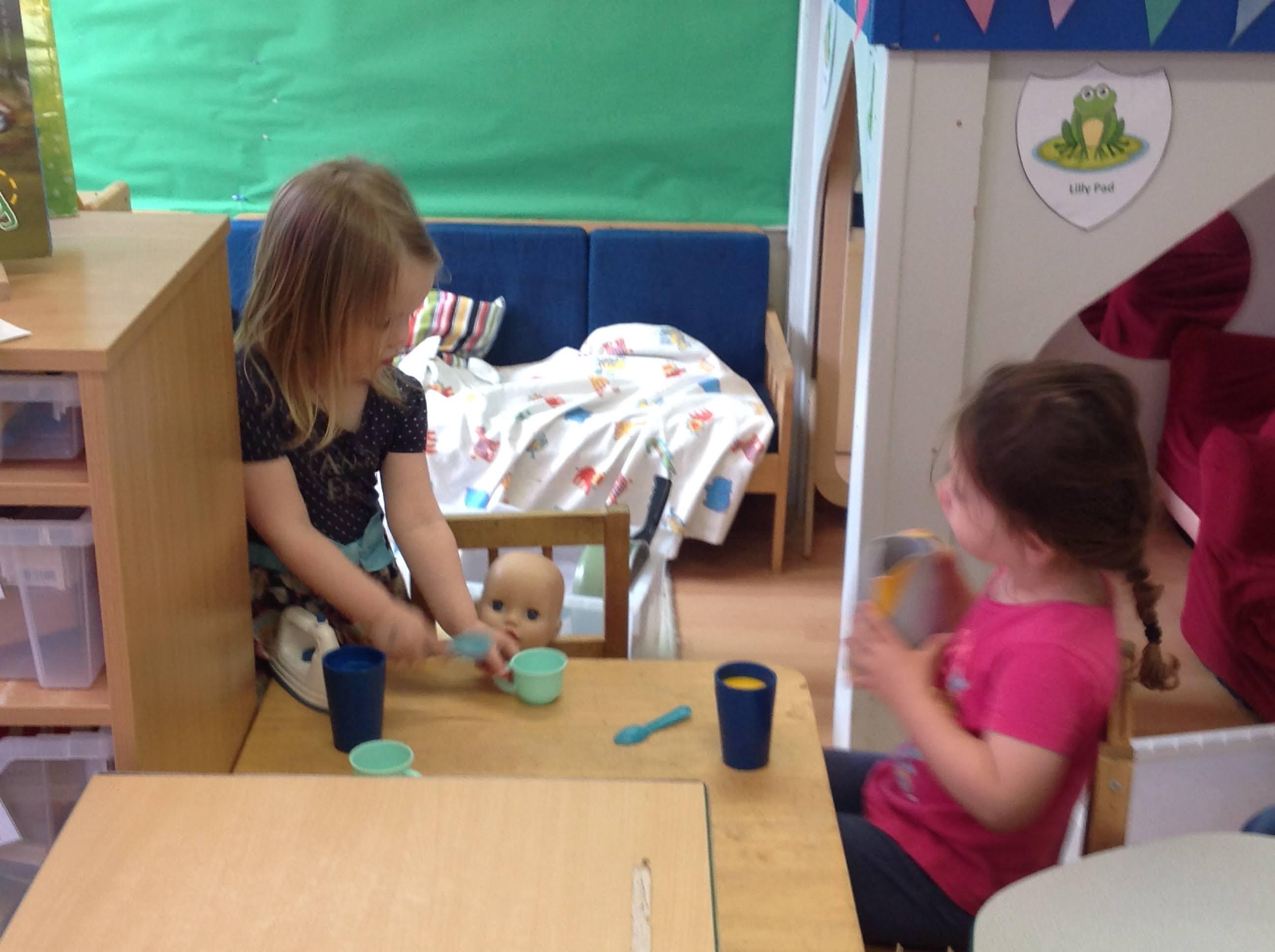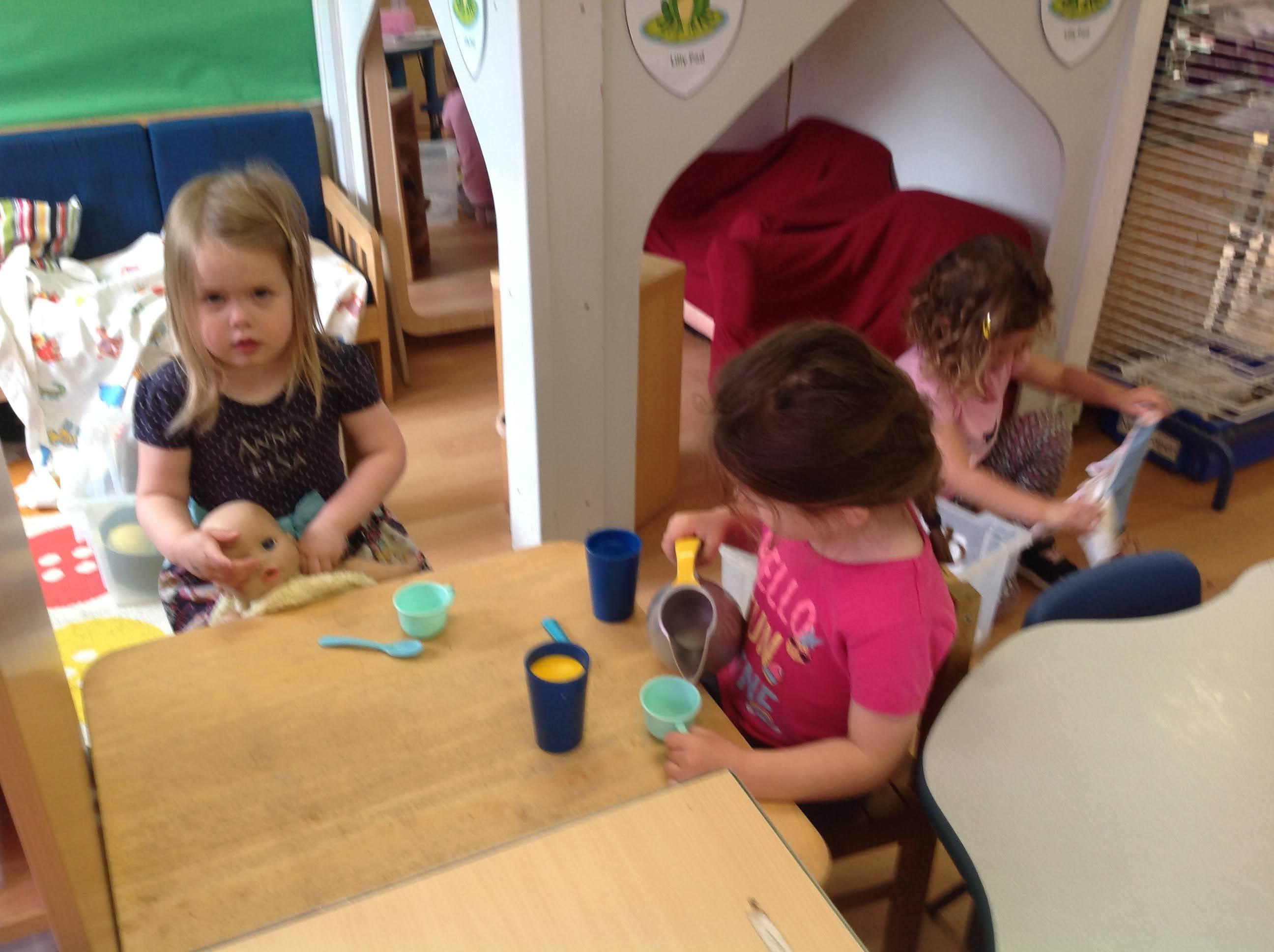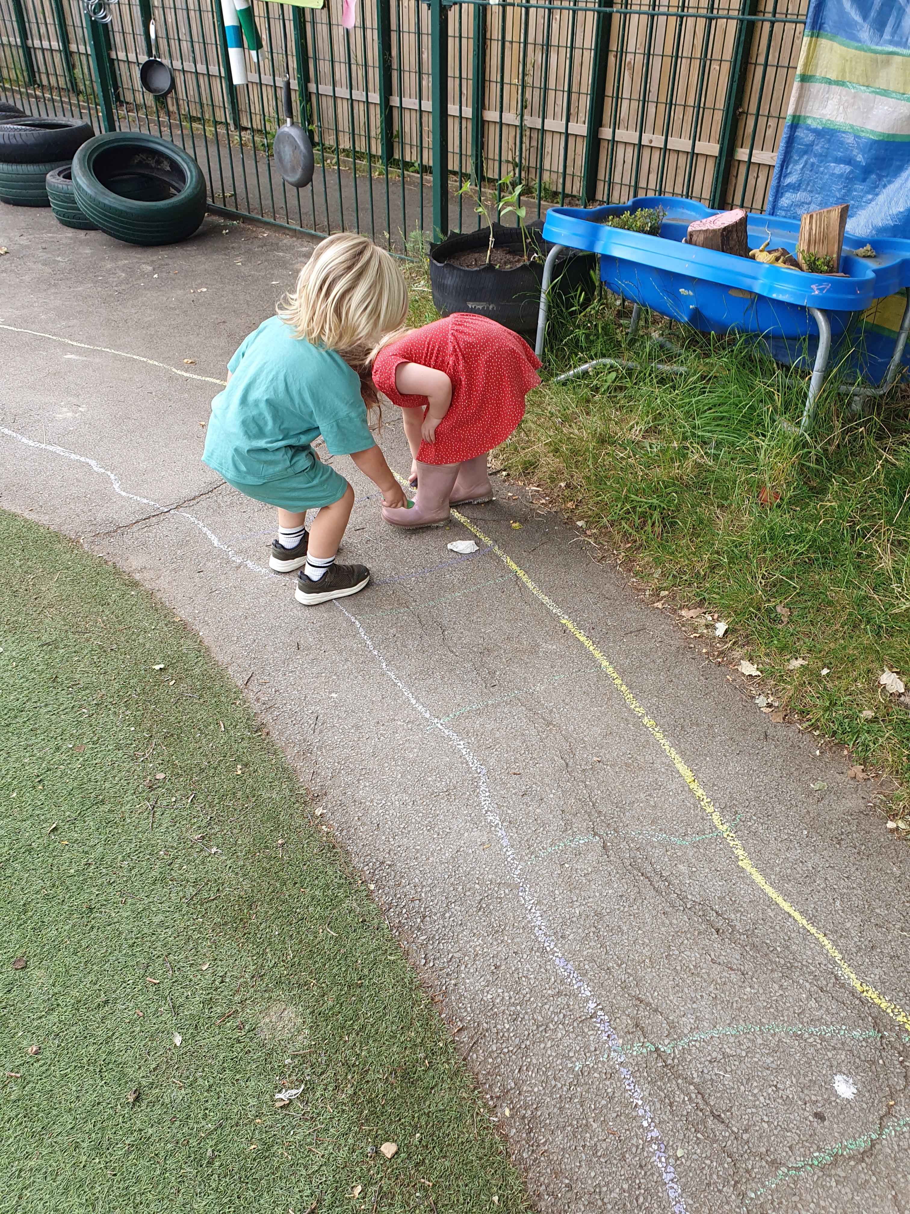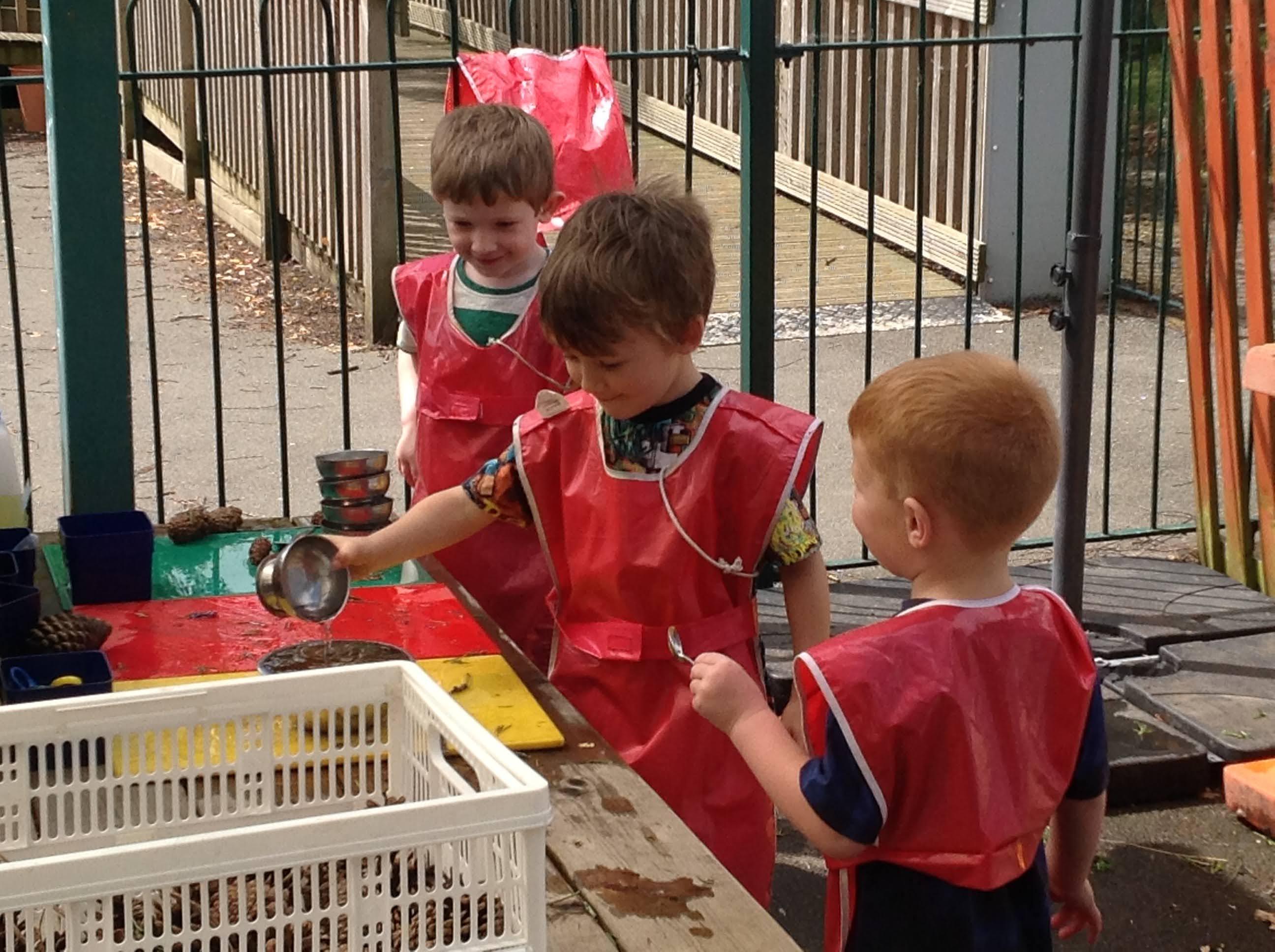 This week we have been reading the story The Train Ride by June Crebbin. We have been making trains and tracks with a variety of resources. There have also been creative ways to cool down in the heat from putting our feet in the tuff tray of water and running under the jets of water from the hose. You may have noticed that our garden kitchen has been moved about, allowing it to be easier to use water in it. There are four new water containers to hold the different colour water for mixing. All the children have enjoyed spending time in there this week.