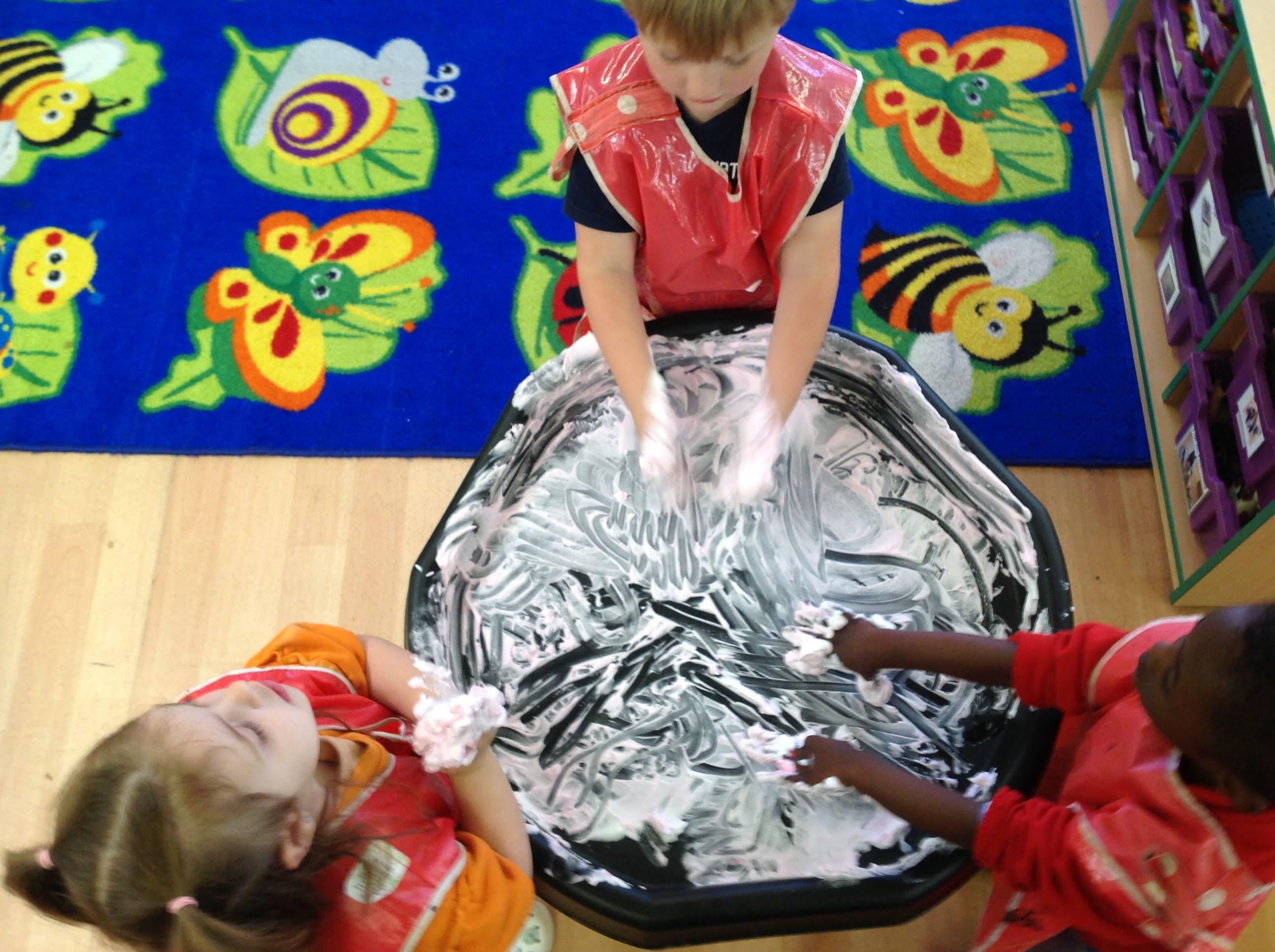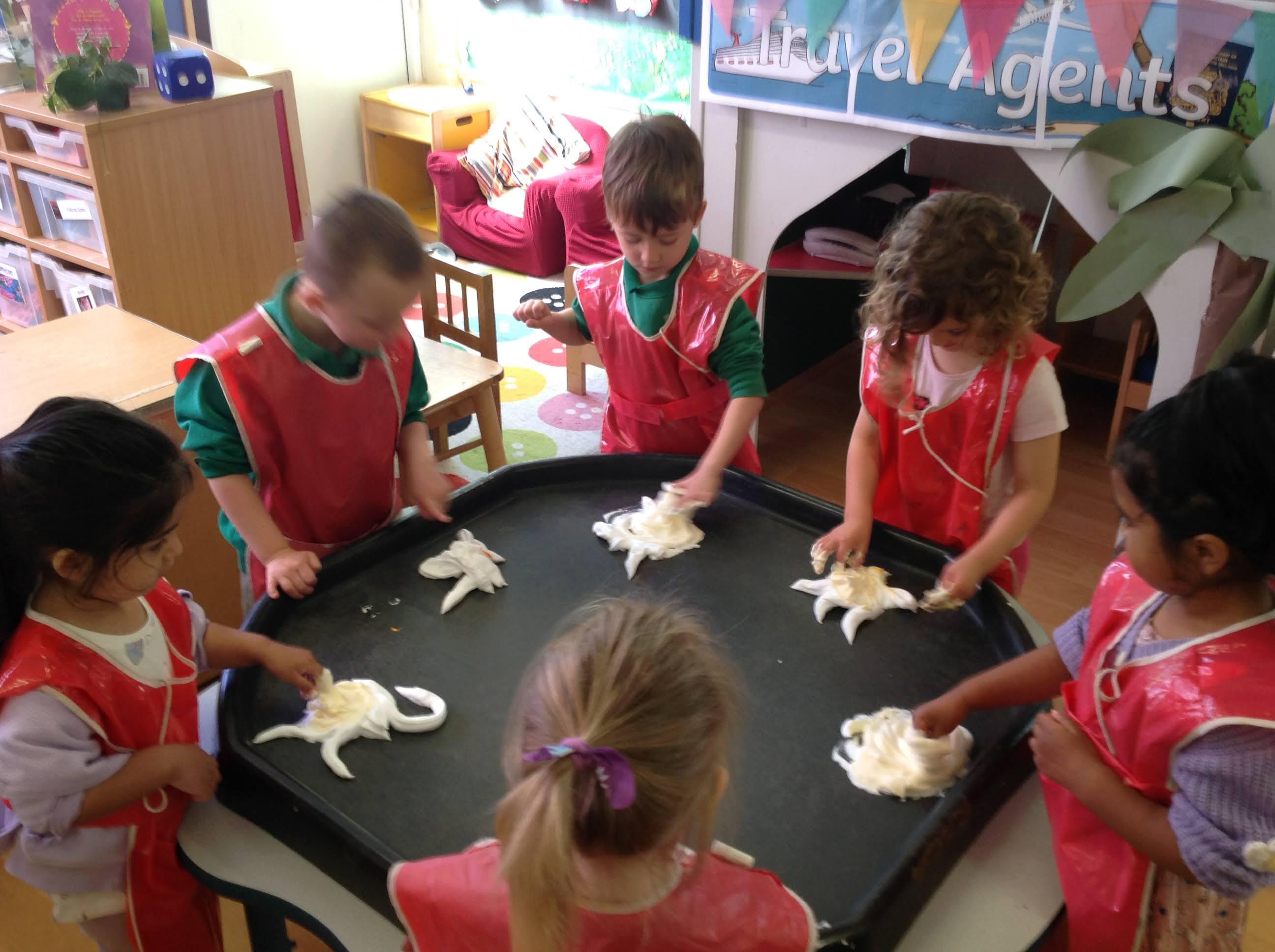 This week we have been reading the story of What the Ladybird Heard at the Seaside by Julia Donaldson. Luckily it has been a sunny week to be at the seaside. We have been making flags to go on our sandcastles. There was lots of fun when we went 'swimming' in the sea on the blue tarpaulin. You can see some of the Barn Owls were using their floats to help them swim! We enjoyed exploring the different shells and making prints with them in the playdough. Some Barn Owls enjoyed a Forest School session this week. Those not at Forest School took part in the Write Dance activity, where we used shaving foam and paint to create patterns to help develop our writing skills.
