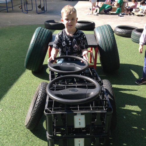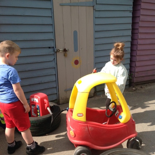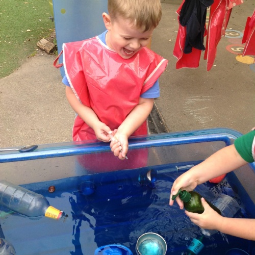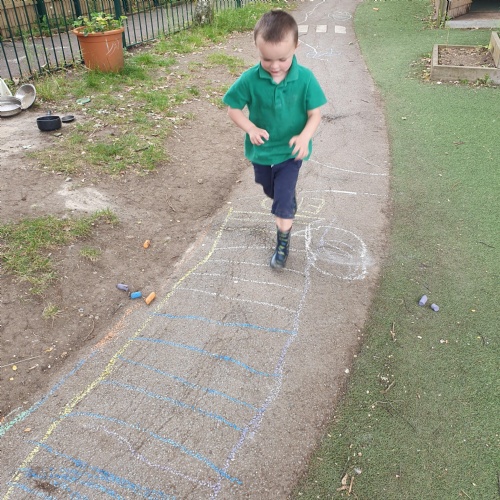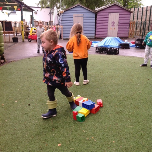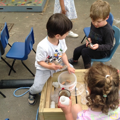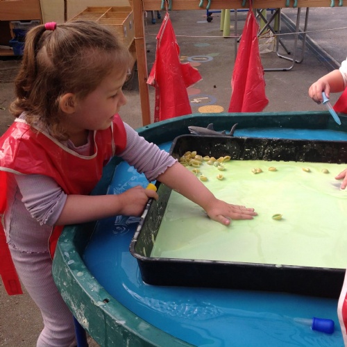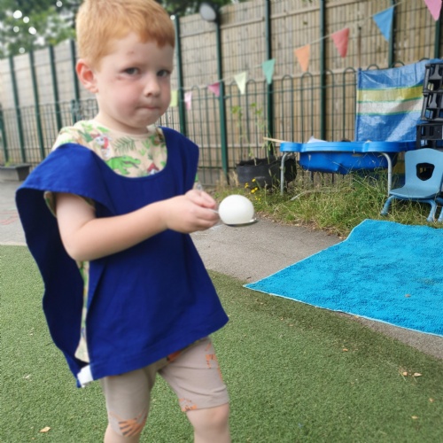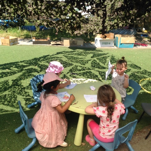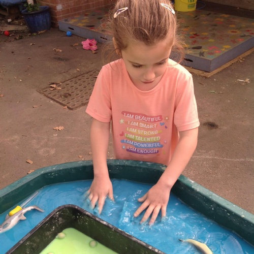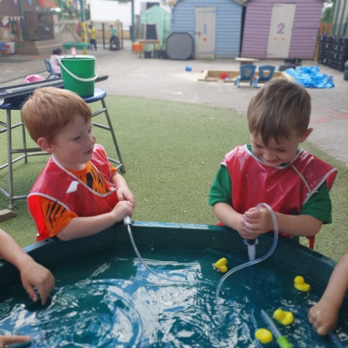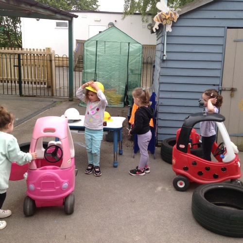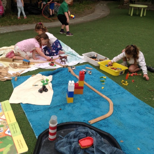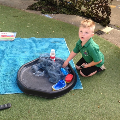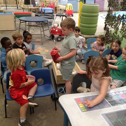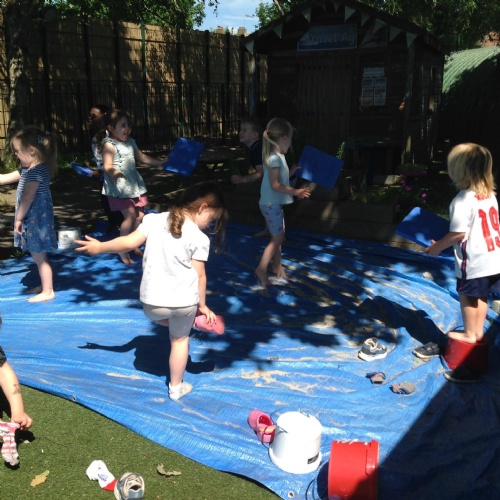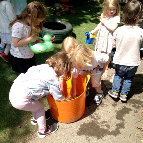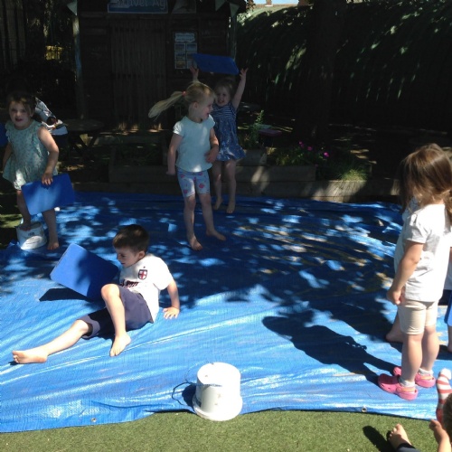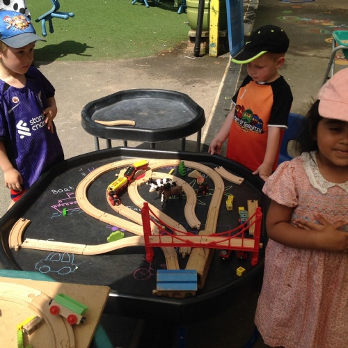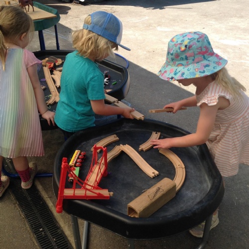 This week we have been reading the story The Train Ride by June Crebbin. We have been making trains and tracks with a variety of resources. There have also been creative ways to cool down in the heat from putting our feet in the tuff tray of water and running under the jets of water from the hose. You may have noticed that our garden kitchen has been moved about, allowing it to be easier to use water in it. There are four new water containers to hold the different colour water for mixing. All the children have enjoyed spending time in there this week.