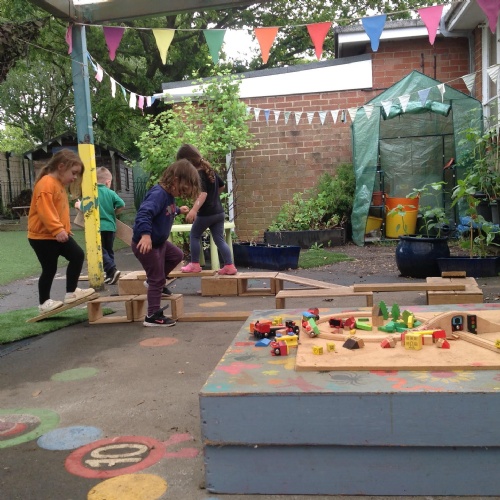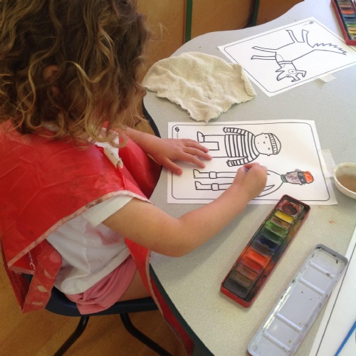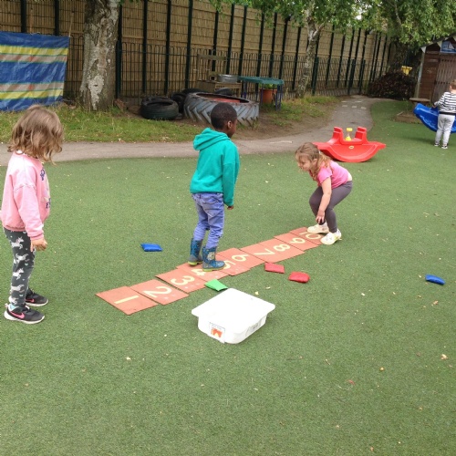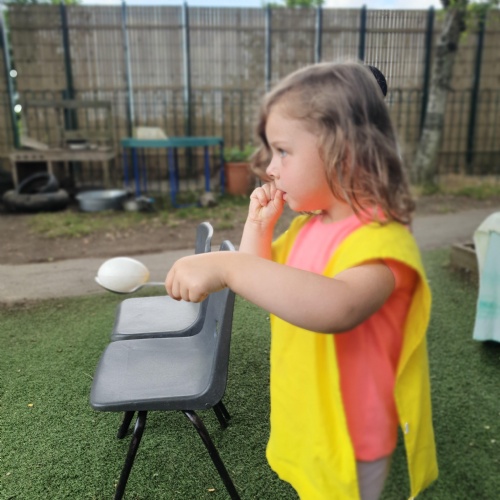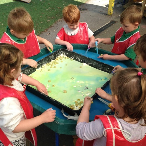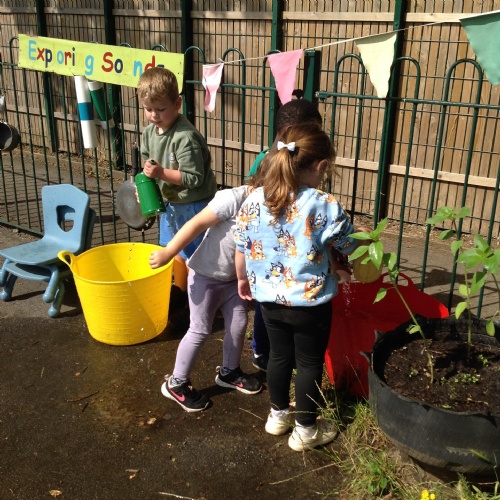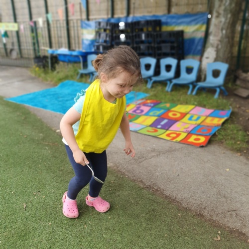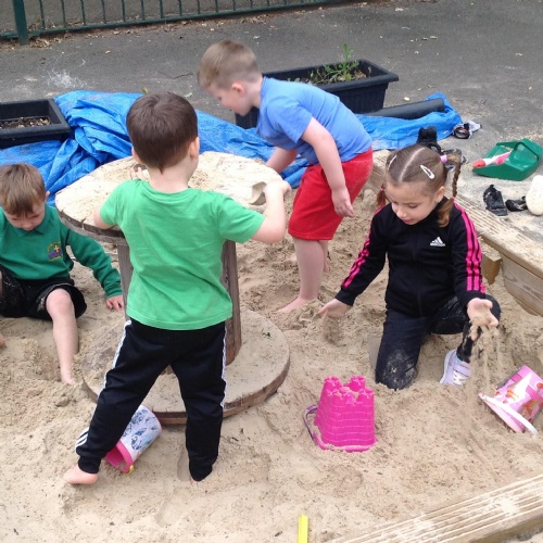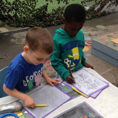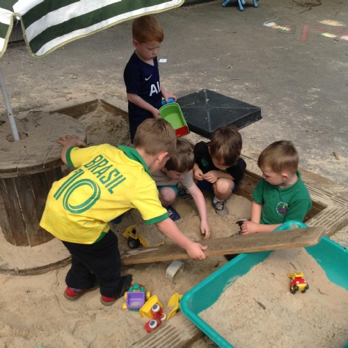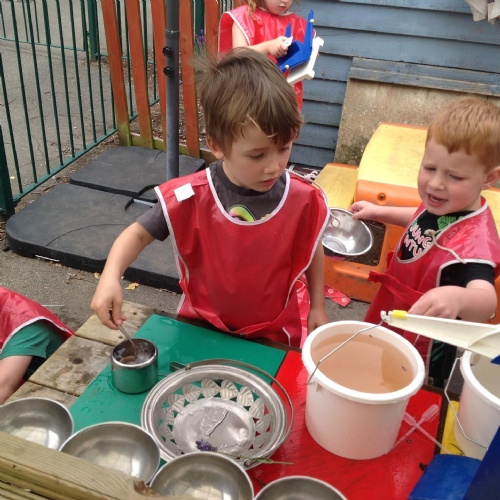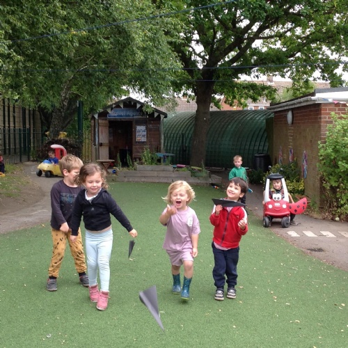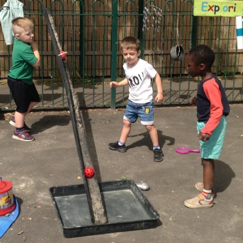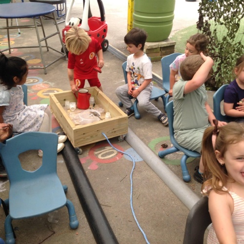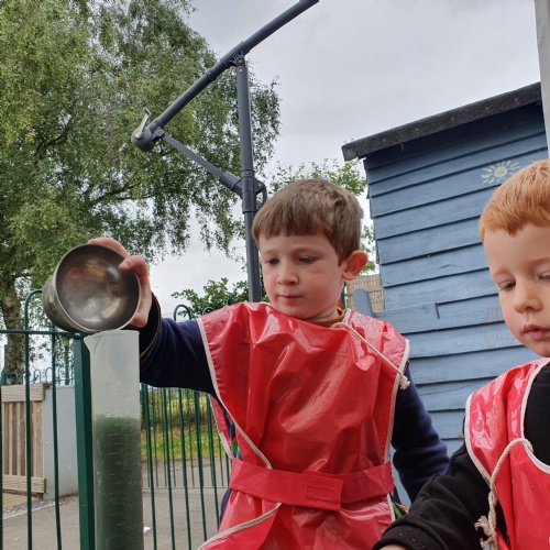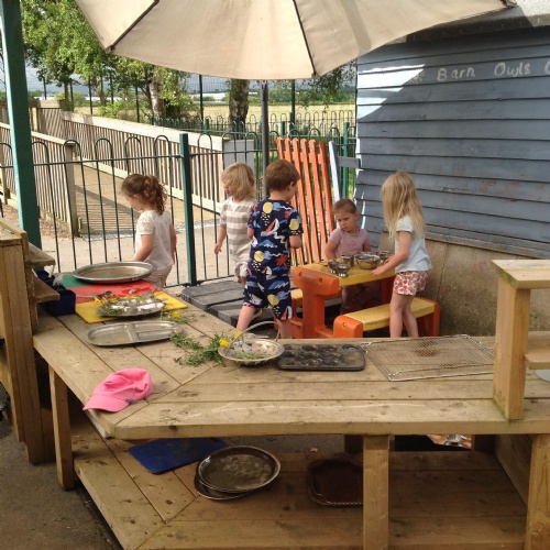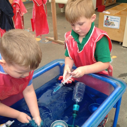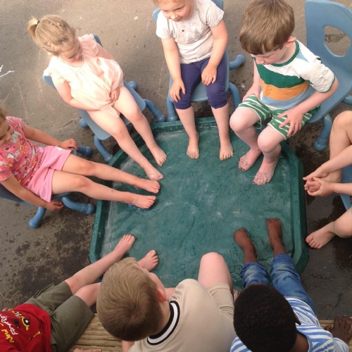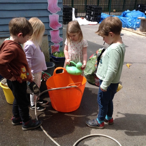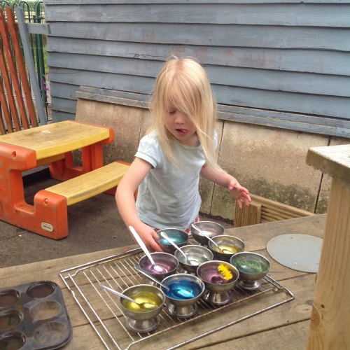This week we have been reading the story The Train Ride by June Crebbin. We have been making trains and tracks with a variety of resources. There have also been creative ways to cool down in the heat from putting our feet in the tuff tray of water and running under the jets of water from the hose. You may have noticed that our garden kitchen has been moved about, allowing it to be easier to use water in it. There are four new water containers to hold the different colour water for mixing. All the children have enjoyed spending time in there this week.
