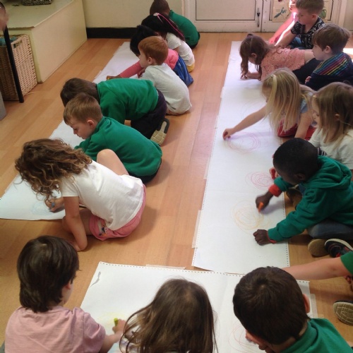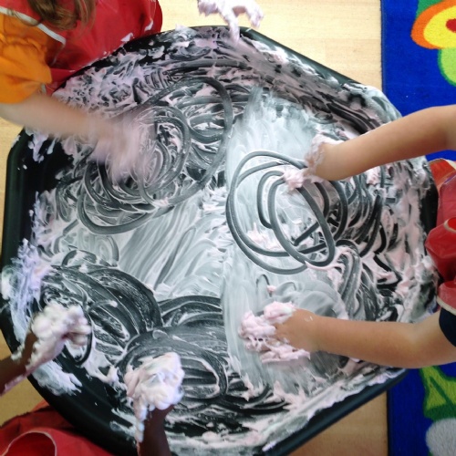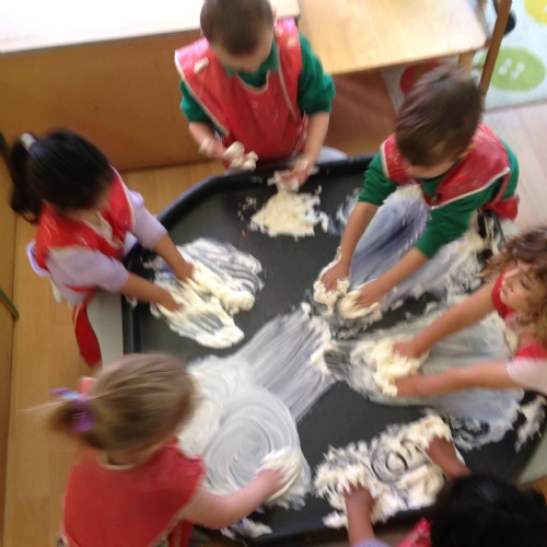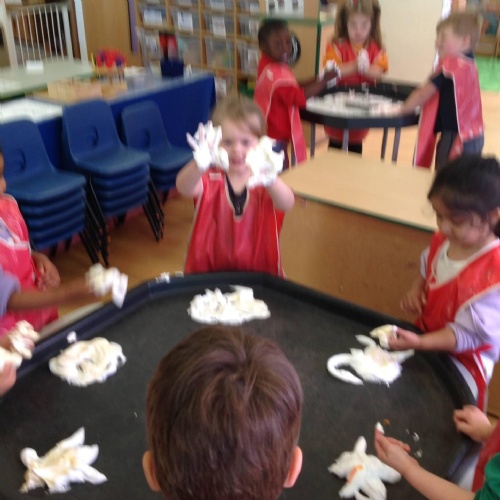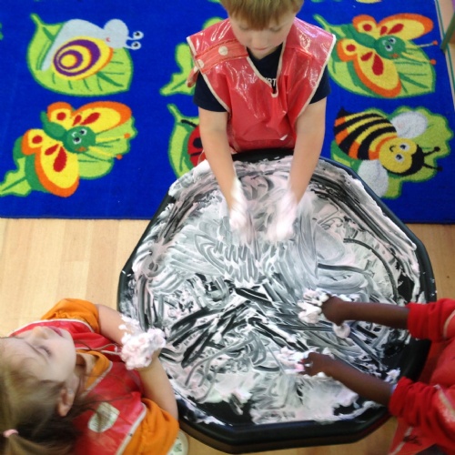 This week we have been reading the story of What the Ladybird Heard at the Seaside by Julia Donaldson. Luckily it has been a sunny week to be at the seaside. We have been making flags to go on our sandcastles. There was lots of fun when we went 'swimming' in the sea on the blue tarpaulin. You can see some of the Barn Owls were using their floats to help them swim! We enjoyed exploring the different shells and making prints with them in the playdough. Some Barn Owls enjoyed a Forest School session this week. Those not at Forest School took part in the Write Dance activity, where we used shaving foam and paint to create patterns to help develop our writing skills.