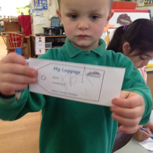 This week we have been reading the book Amazing Aeroplanes by Tony Mitton and Ant Parker. The castle was our check in desk, the home corner became the airport lounge and you would have seen our plane in the garden, ready for take off. There was even a trolley for the cabin crew to serve refreshments. Children have been learning about the job of the pilot and what happens when we go to the airport to fly. The children have been making passports and luggage labels. You can see from the photos they have packed their suitcases for sunny destinations!